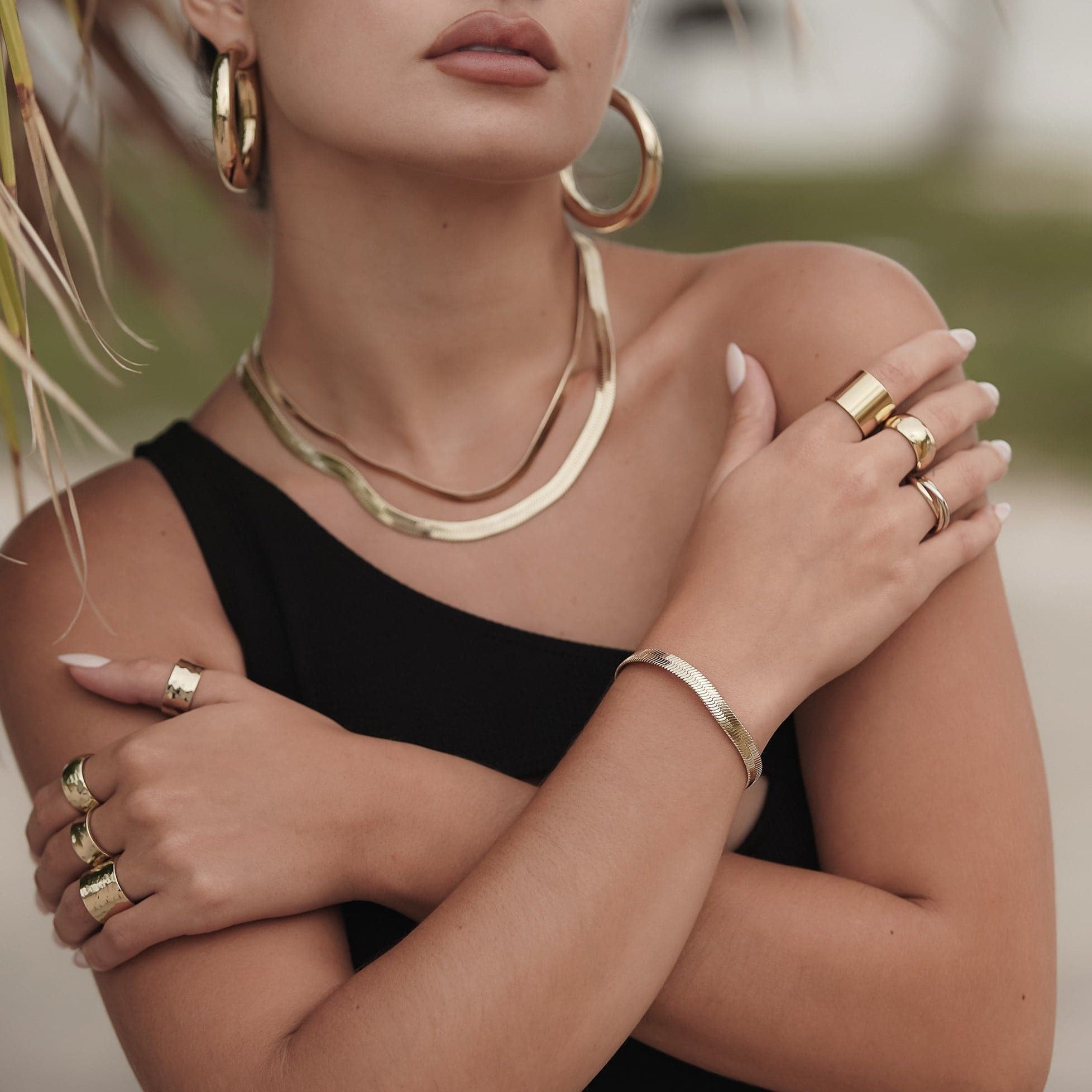 Nuestro anillo plano grueso es una pieza llamativa. Llévelo solo para destacarse o para causar más impacto, combínelo con algunas de nuestras otras opciones de anillos. Todos los anillos tienen una capa protectora transparente para evitar el desgaste rápido y el deslustre.