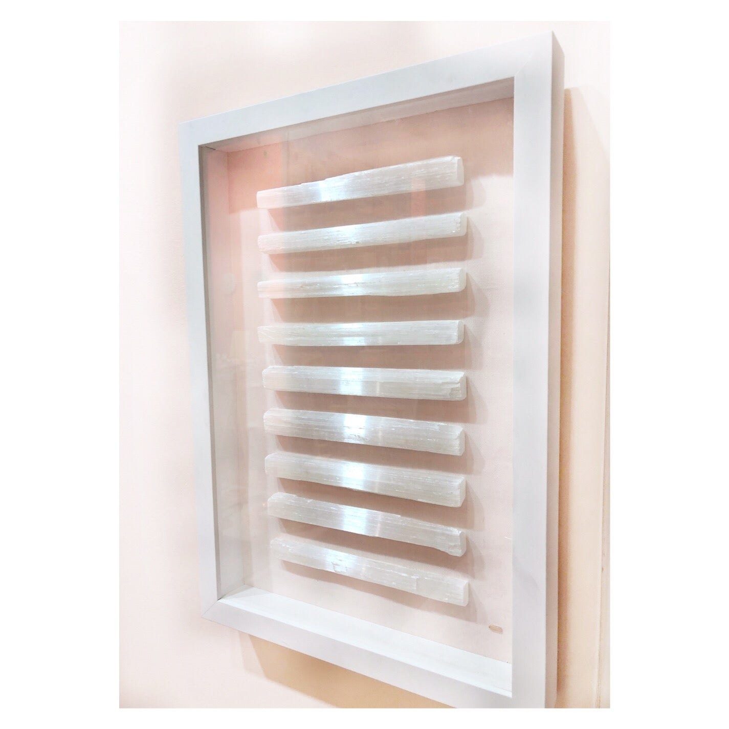 Cada brillante tronco de selenita está cuidadosamente montado sobre un impresionante fondo de tela de lino rosa, bellamente presentado dentro de una elegante caja de sombras. Esta combinación única crea una mezcla armoniosa de texturas y colores, lo que da como resultado una obra de arte verdaderamente cautivadora.