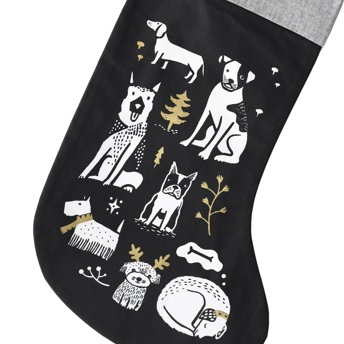 This Christmas stocking will give a touch of Wee Gallery to your family holiday season. Festive Pups is printed in white on black 100% organic cotton twill with gold highlights. The inner layer of the stocking is printed with golden dots. Grey band at the top with sturdy loop for hanging. Made in India using ethical manufacturing practices.