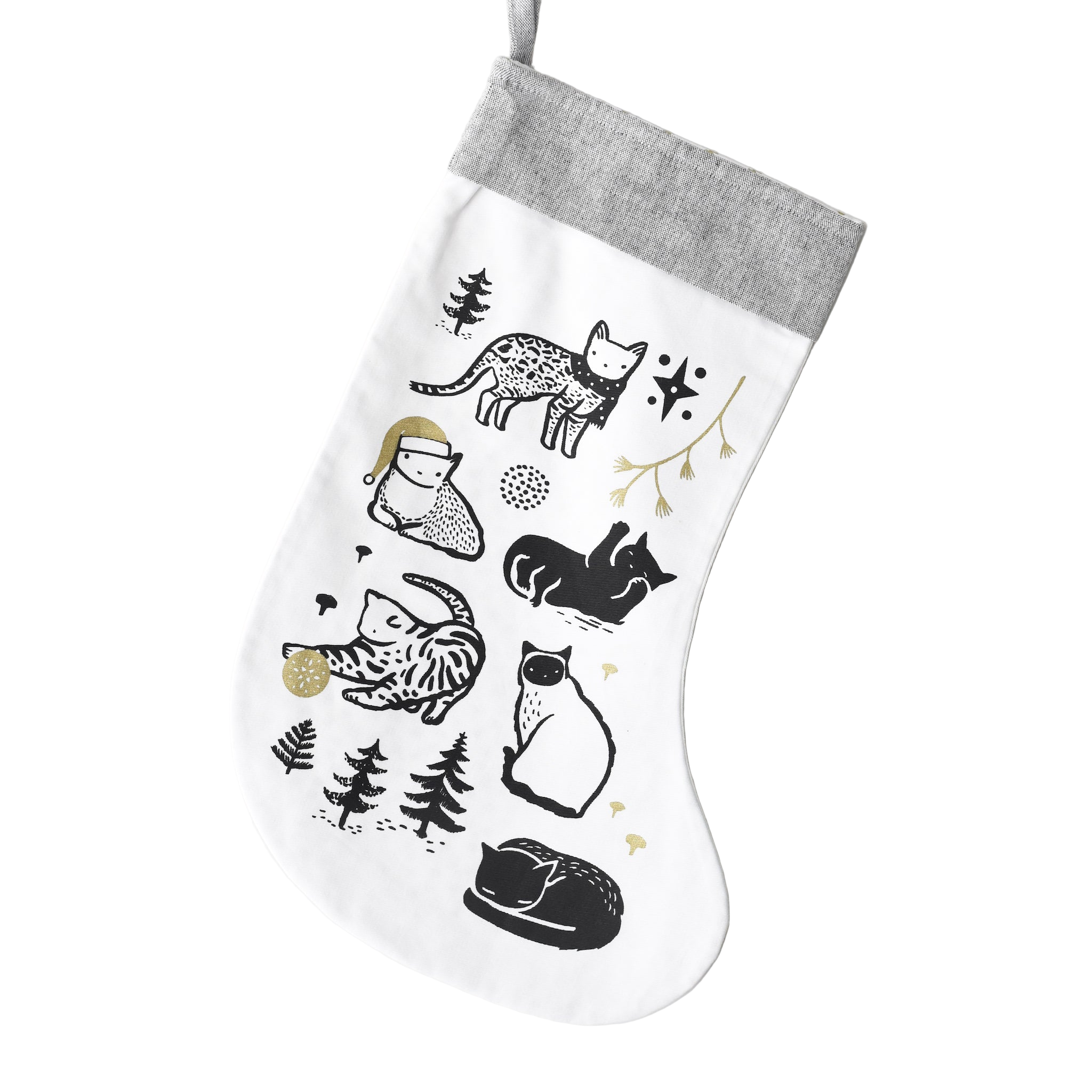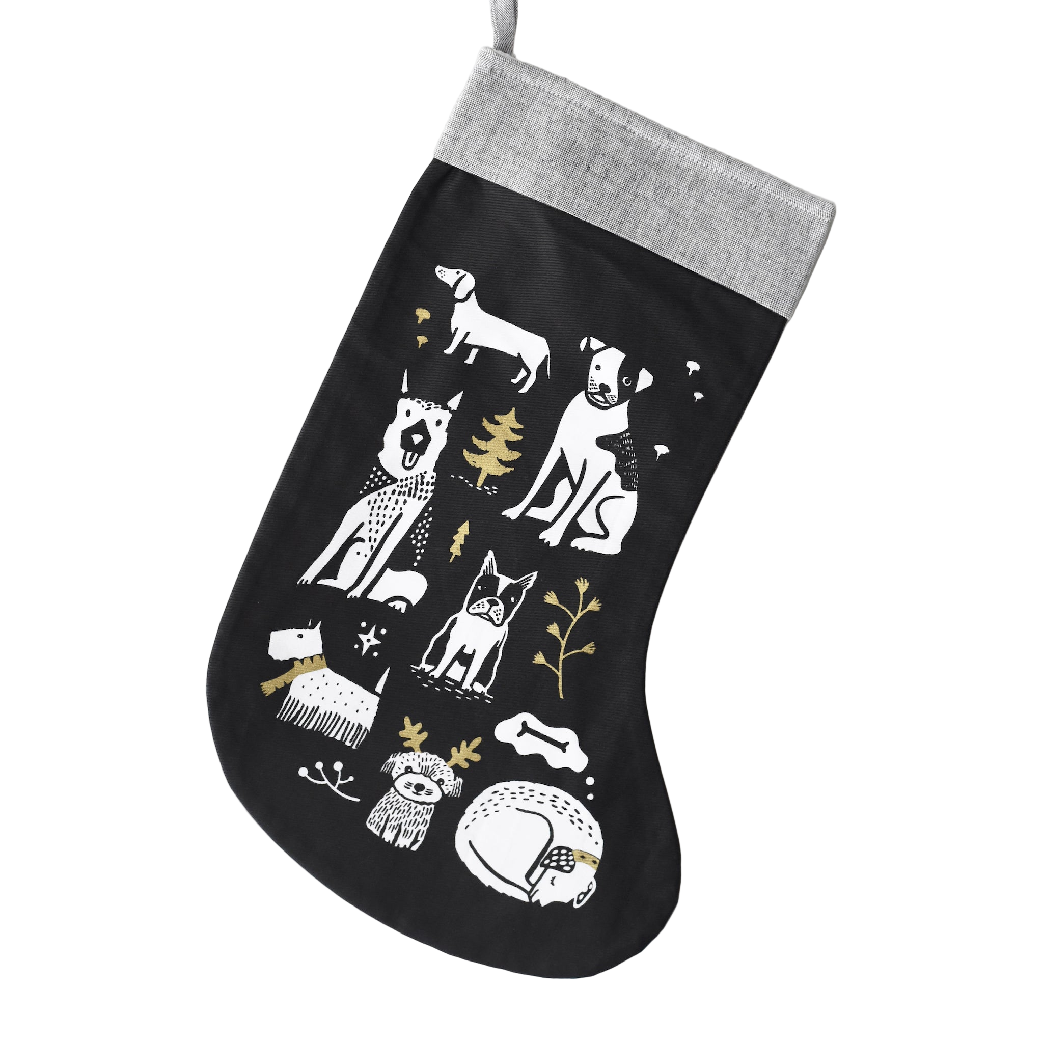 This Christmas stocking will give a touch of modern minimalist decor to your holiday season. Our monochromatic stockings are printed in white on black 100% organic cotton twill with gold highlights. The inner layer of the stocking is printed with golden dots. Grey band at the top with sturdy loop for hanging.