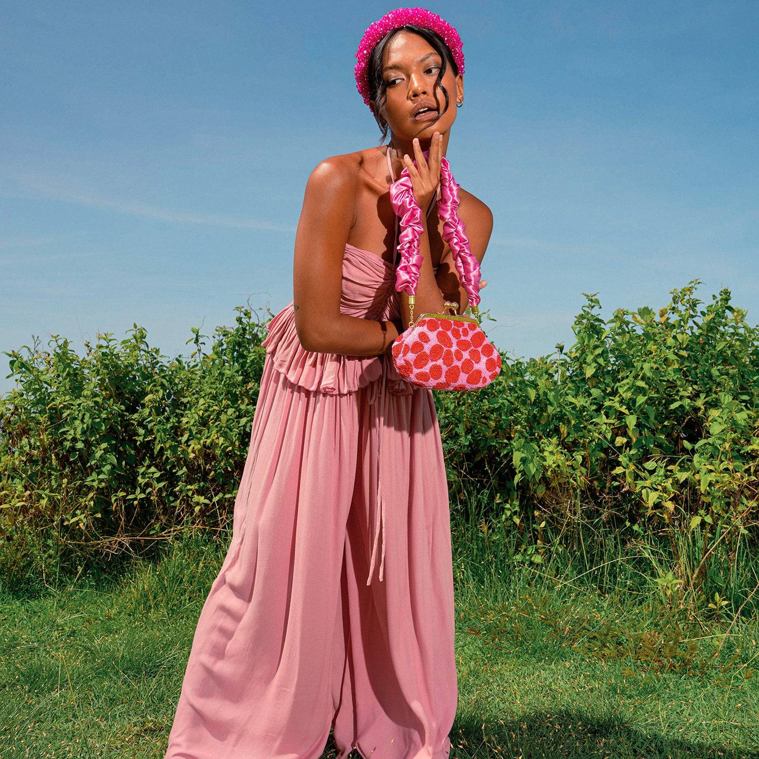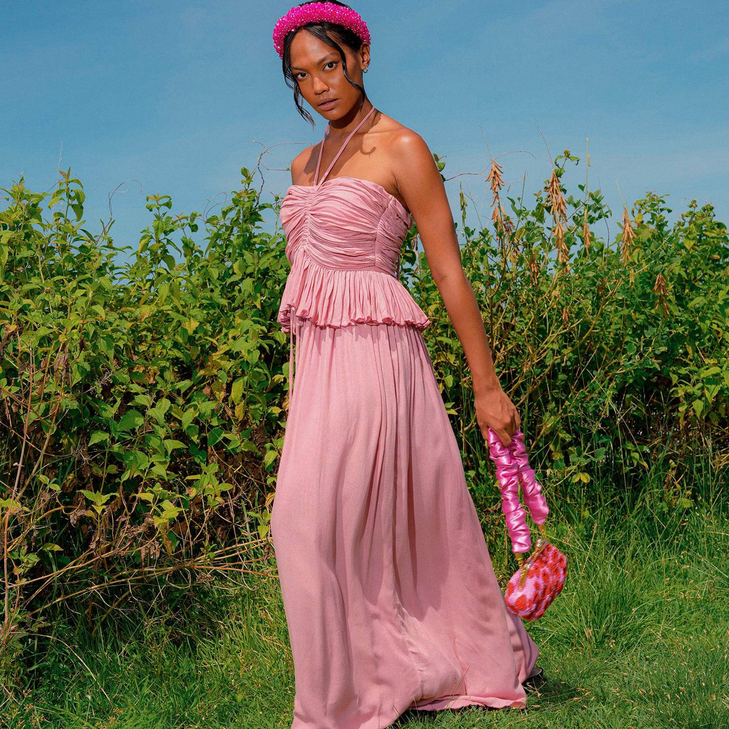 SRI es un mono romántico de espíritu libre confeccionado con un tejido de bambú ligero y elegante para la temporada de vacaciones. Con una gran cantidad de detalles fruncidos y un espectacular estilo palazzo de pierna ancha, SRI tiene tirantes halter y una cintura peplum femenina que cautiva y contagia.