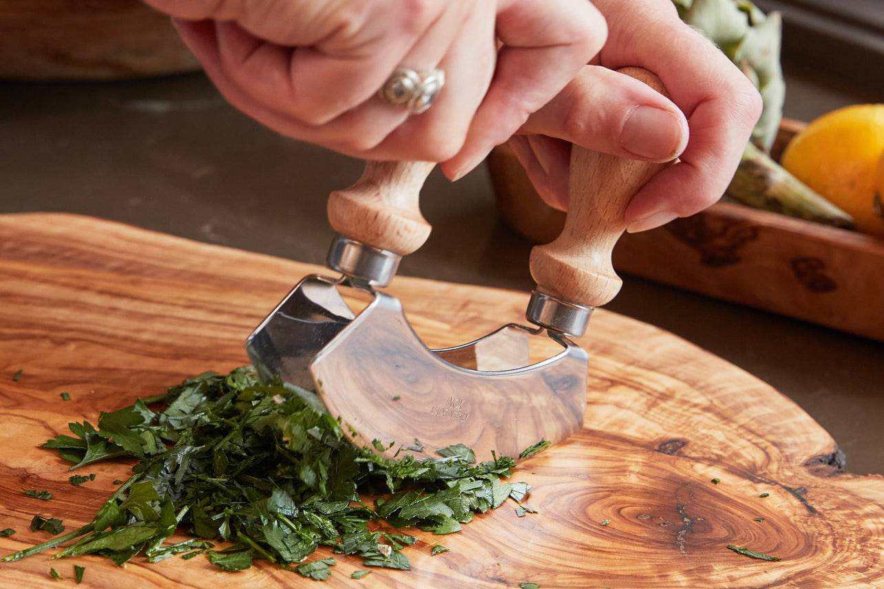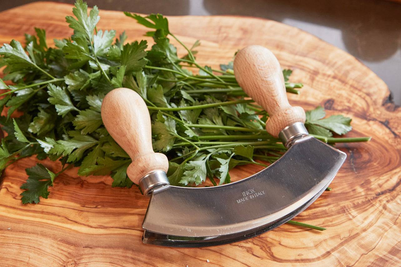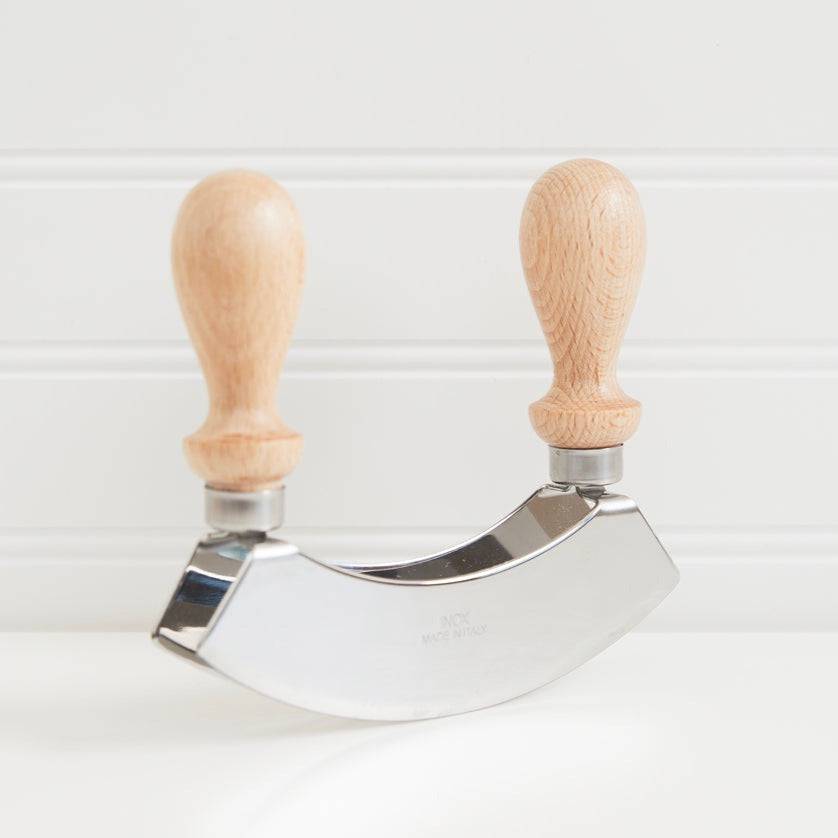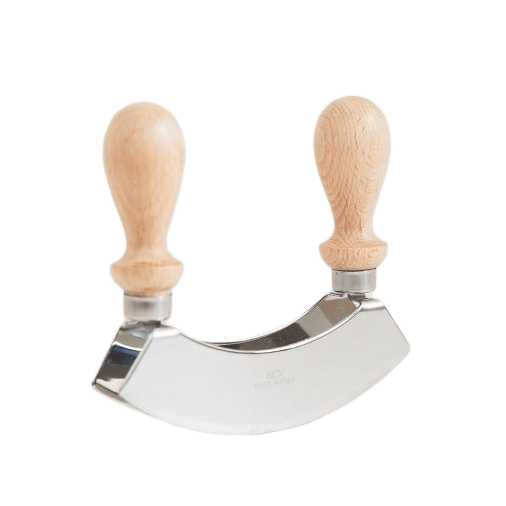 La mezzaluna (que significa “media luna” en italiano) es una herramienta tradicional y una de las favoritas de los cocineros cuando se trata de picar de manera rápida y eficiente. Los mangos de madera de haya resistentes facilitan el agarre y mantienen las manos alejadas de las cuchillas dobles, que se utilizan para picar de manera gruesa hierbas, frutos secos, ajo, nueces, aceitunas, ensaladas y más.