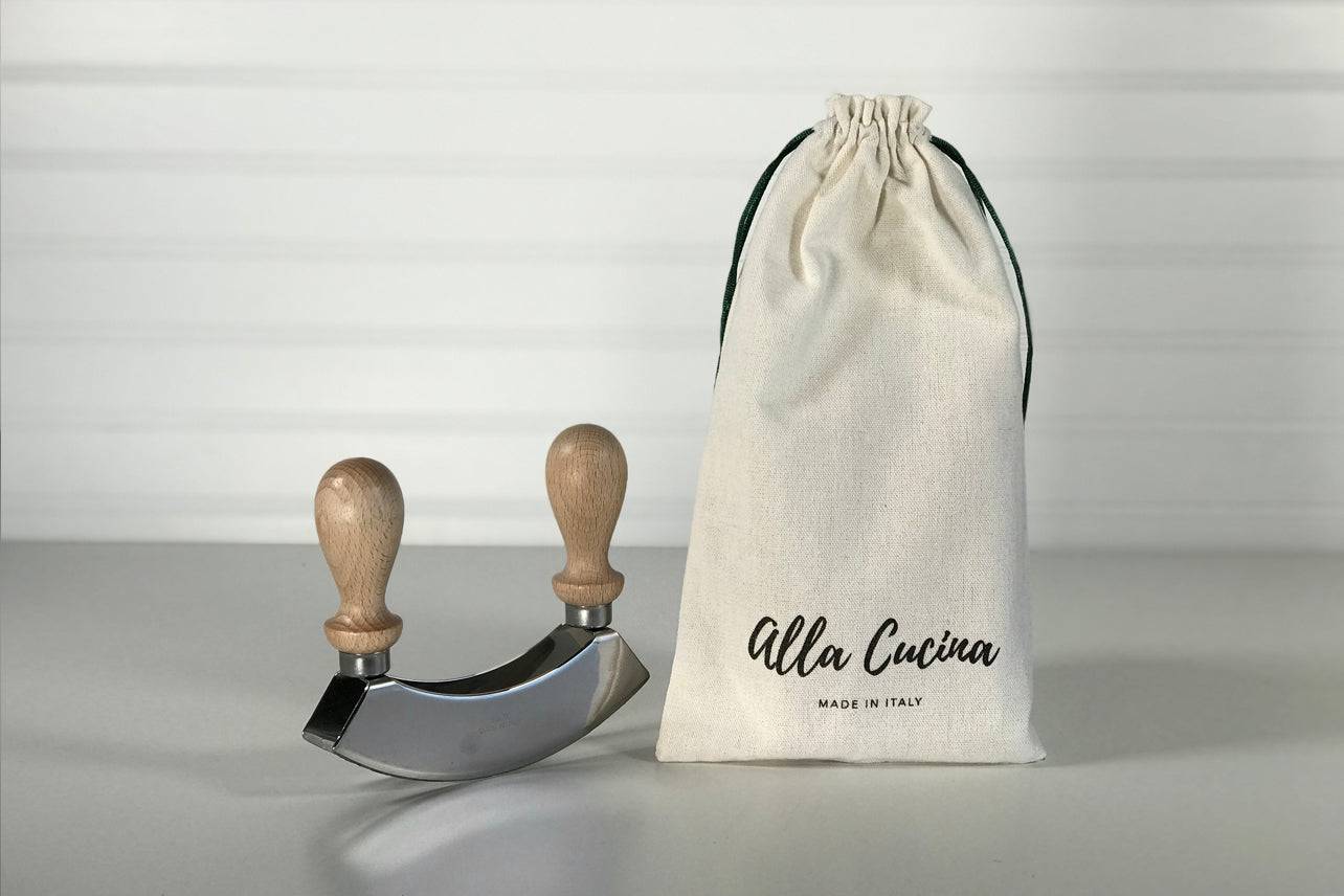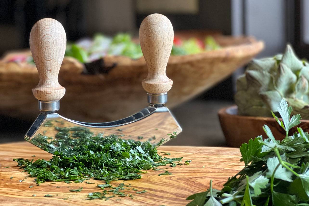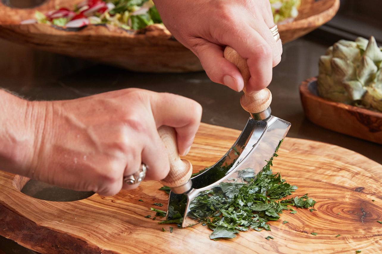La mezzaluna (que significa “media luna” en italiano) es una herramienta tradicional y una de las favoritas de los cocineros cuando se trata de picar de manera rápida y eficiente. Los mangos de madera de haya resistentes facilitan el agarre y mantienen las manos alejadas de las cuchillas dobles, que se utilizan para picar de manera gruesa hierbas, frutos secos, ajo, nueces, aceitunas, ensaladas y más.