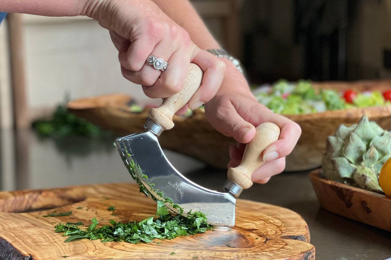 El Mezzaluna corta con un movimiento descendente sin esfuerzo, a diferencia de los cuchillos tradicionales que cortan en línea recta. La cuchilla de un procesador de alimentos pulveriza los ingredientes hasta dejarlos irreconocibles, mientras que la técnica de balanceo del Mezzaluna libera suavemente los aromáticos y los aceites, en lugar de convertir todo en una masa combinada.
