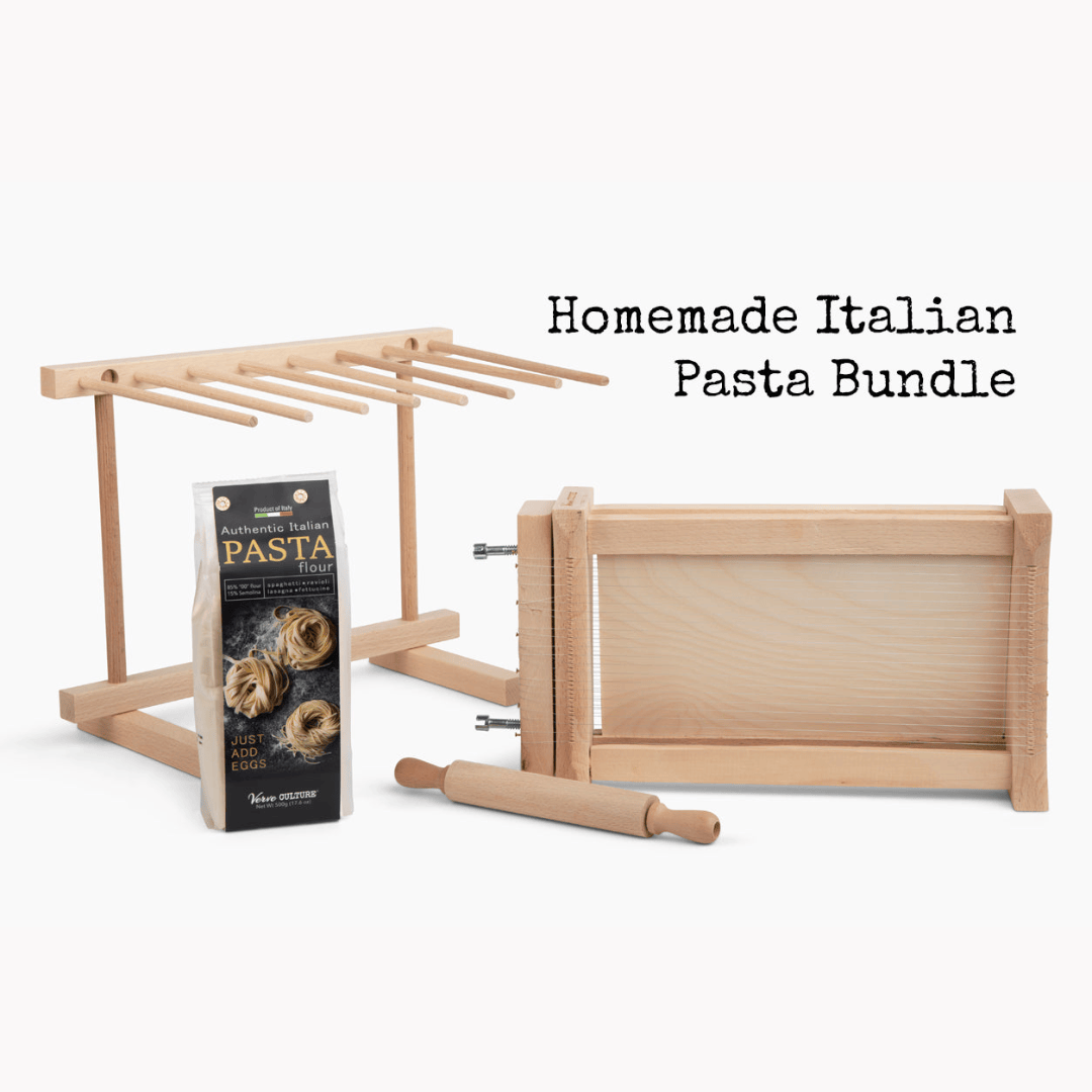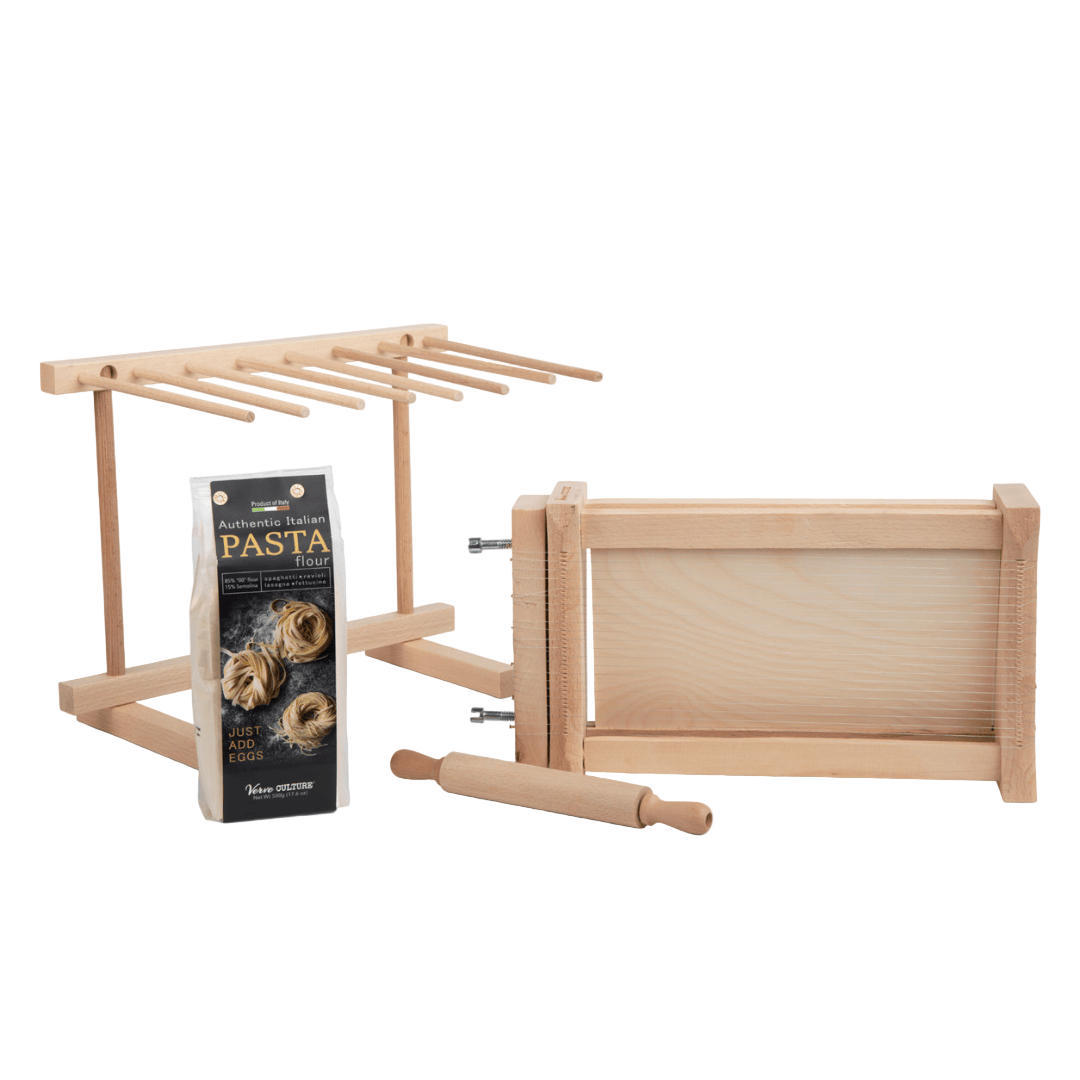 Lleve el sabor de Italia a su cocina con nuestra Chitarrra de pasta italiana con rodillo, para hacer tiras largas de pasta al estilo antiguo. Luego, seque su pasta en nuestra rejilla de secado de pasta plegable de madera de haya italiana para mantenerla fresca y eficiente.