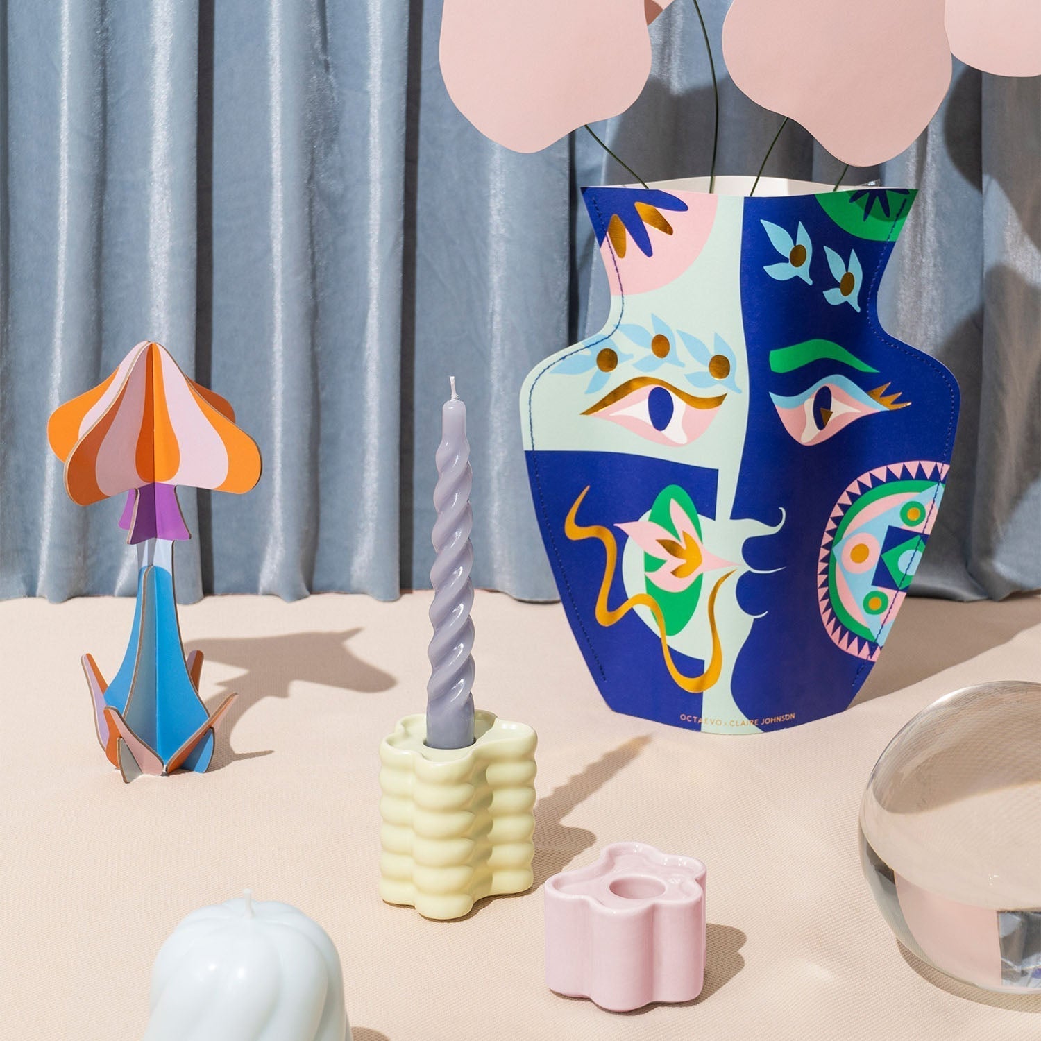These paper vases pay tribute to traditional ceramics through printed motifs, foil accents and handcrafted finishing, while remaining modern and sustainable in spirit. Ideal for special occasions or everyday styling, they offer a playful, portable way to refresh a room without committing to a permanent object.
