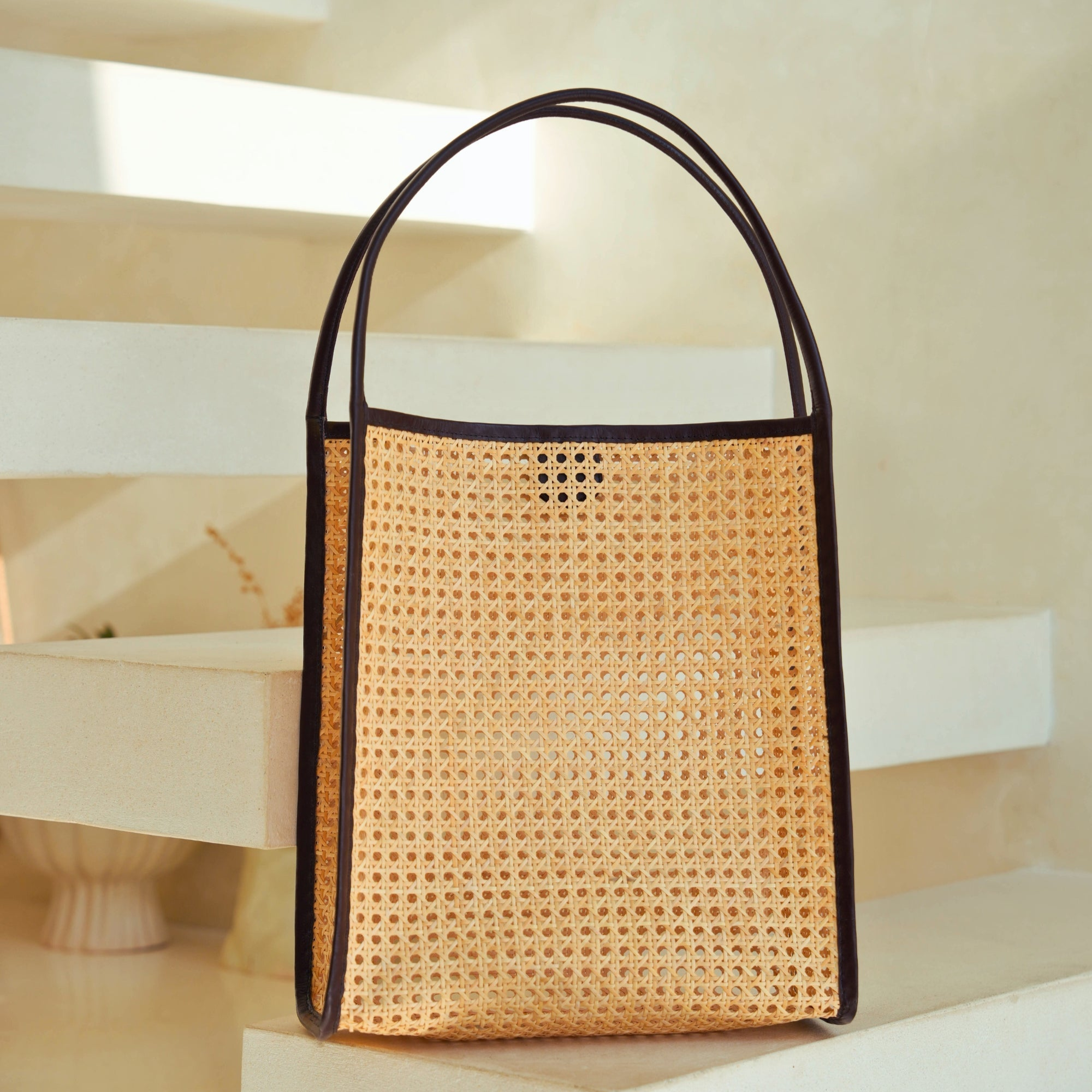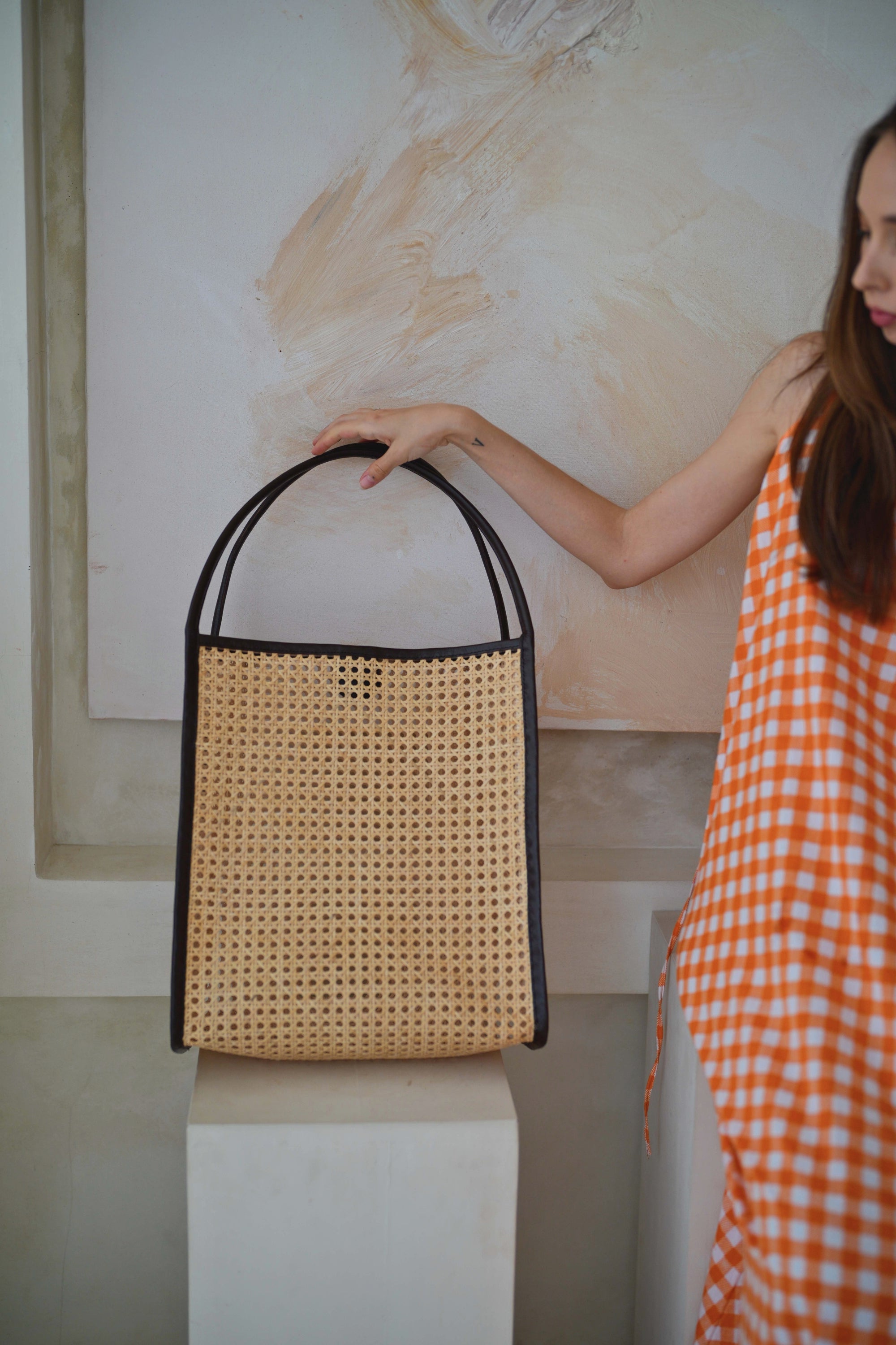 This simple and sleek, oversize and spacious rattan cane and leather trim tote with a unique shape is perfect for those on-the-go who want to carry in chic style.