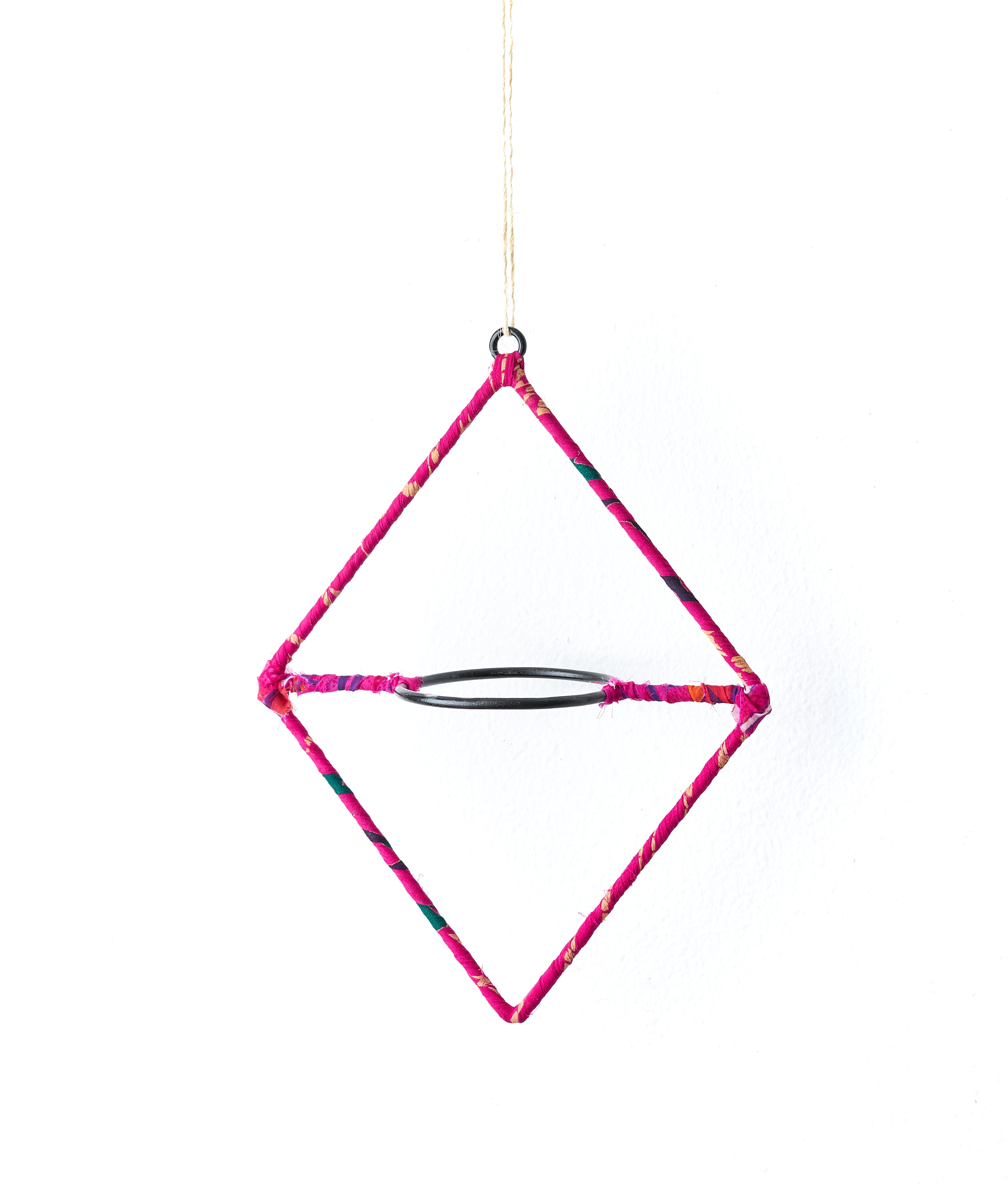 Pottery is an age-old art from which has been passed down for generations in Rajasthan. Vibrant, upcycled sari accents provide for a one of a kind quality. Handcrafted hanging planter features small terracotta pot suspended in an airy diamond setting with assorted, upcycled sari wrapping. With drainage hole.