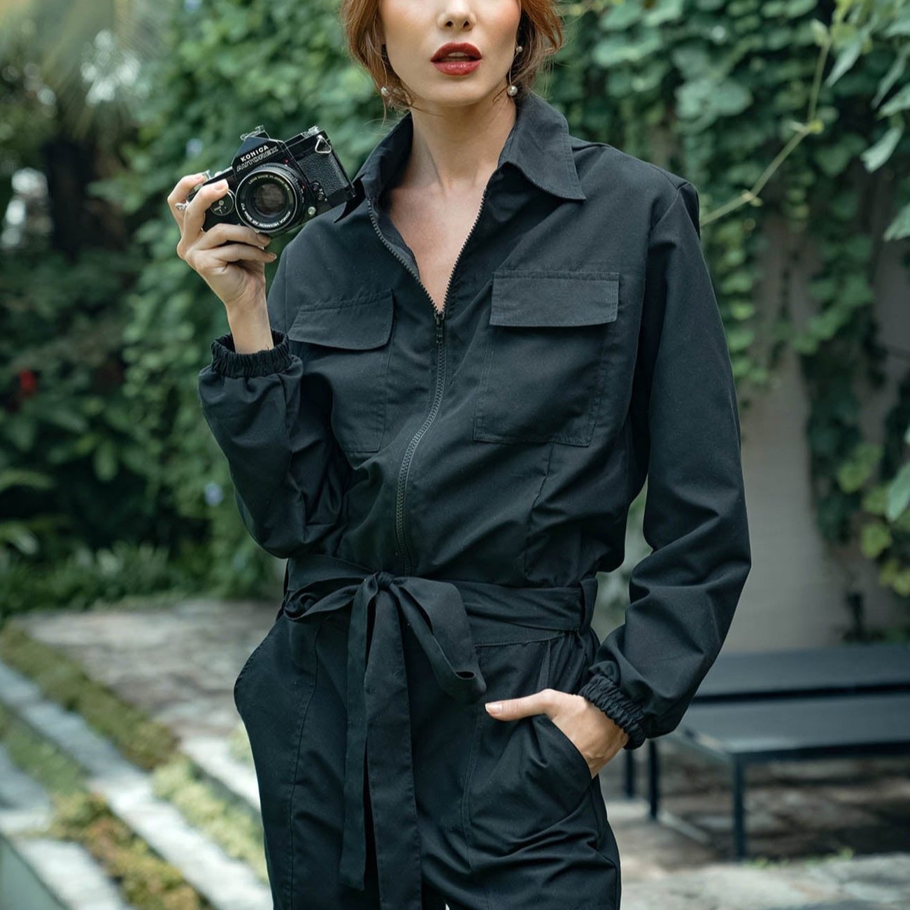 Our cool and casual Amelia Jumpsuit in black with its relaxed style is designed for the perfect traveling or outdoor occasion; whether it’s a date to an art exhibit or a rooftop brunch gathering with close friends. This precious piece was named after one of our forever muses, Amelia Earhart, the first female aviator to fly solo across the Atlantic ocean. Complete with a spread collar, tie waist, and front utility pockets, this chic jumpsuit offers a simple yet stylish look. Pair with strappy heels and a small satchel for a classic and feminine vibe.