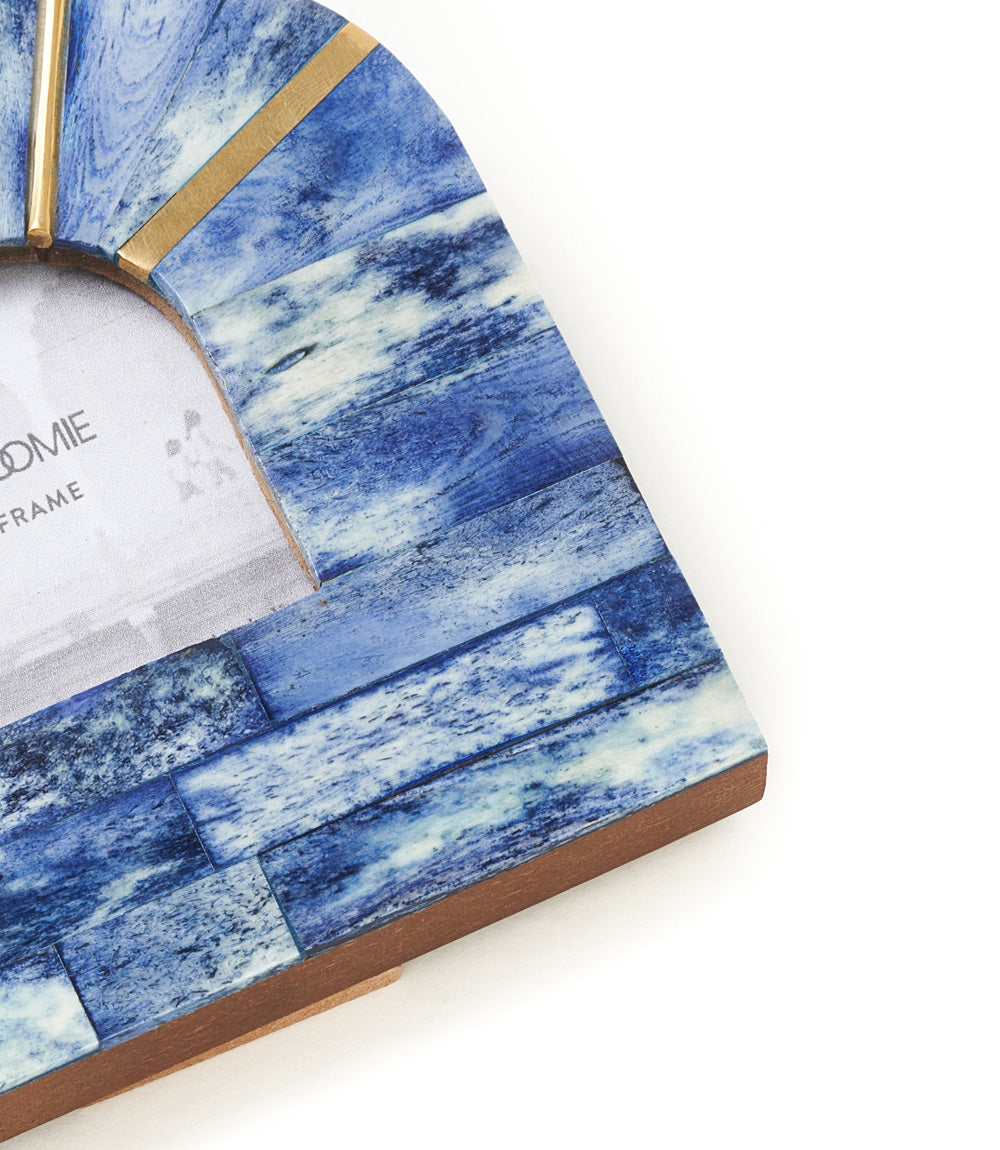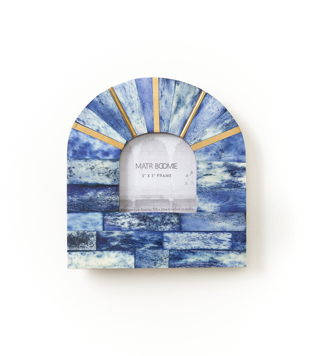 Expanding the Artemis Collection this hand carved picture frame features ethically sourced, cruelty free bone tile in shades of blue in a small arch shape with brass accents. For convenient display this photo frame features a one-way table top easel and metal d-ring for hanging. Frame accommodates 2.5x2.5 photo or print, easily accessed with metal swivel tabs and removable back. Frames in various shapes, sizes, designs and colors, can be displayed together to make a unique gallery wall display.