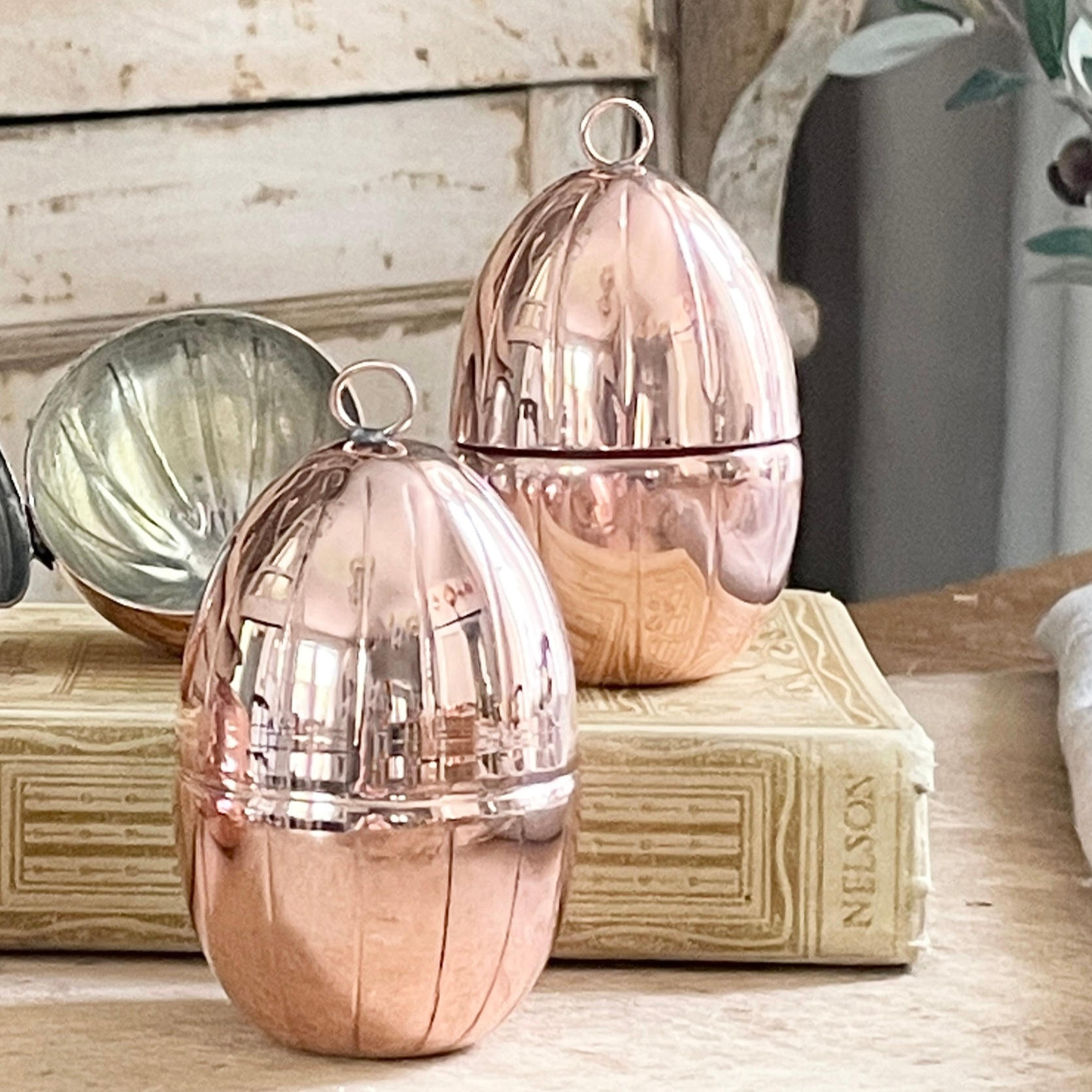 Our Vintage Inspired Copper Handmade Egg Ornaments Set has become an even more cherished part of our collection with the exciting introduction of a second, reimagined design. Drawing inspiration from the original set that was deeply rooted in family tradition, we've taken our love for these unique ornaments and expanded it, offering a new twist on a beloved classic. These fluted egg ornaments, meticulously crafted to reflect the beauty and intricacy of their inspiration, now feature a functionality that allows them to open and close thanks to a strong and durable hinge. This thoughtful detail not only enhances their charm but also their versatility, making them a delightful addition to any festive decor.