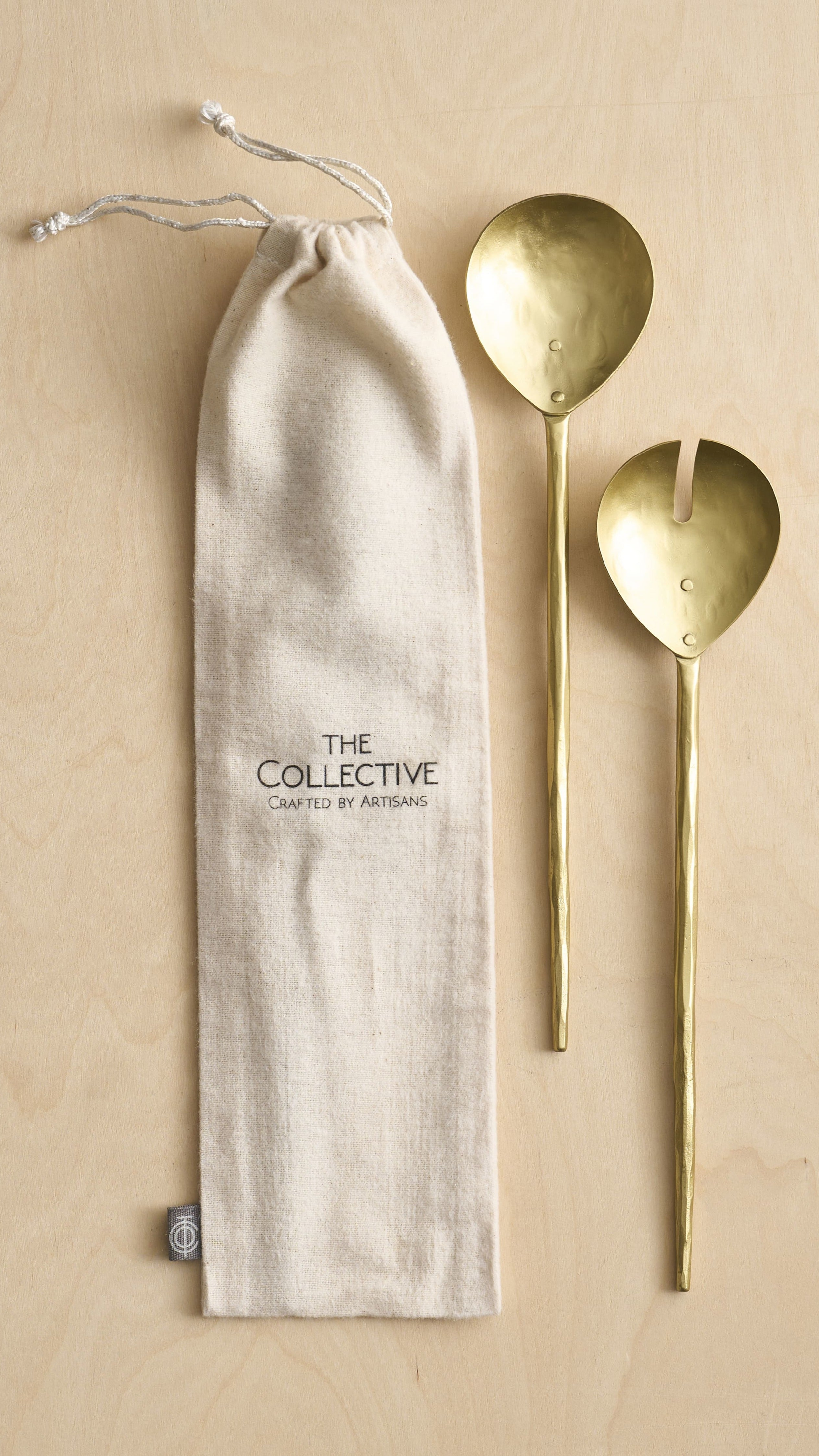 Whether serving fruit or greens, these alluring tools do it with style. Rounded fork and spoon ends with long, tapered handles result in servers sized for large or small bowls. These hammered steel servers are finished in brass, and include a branded flannel storage bag. Also available in a pewter finish.