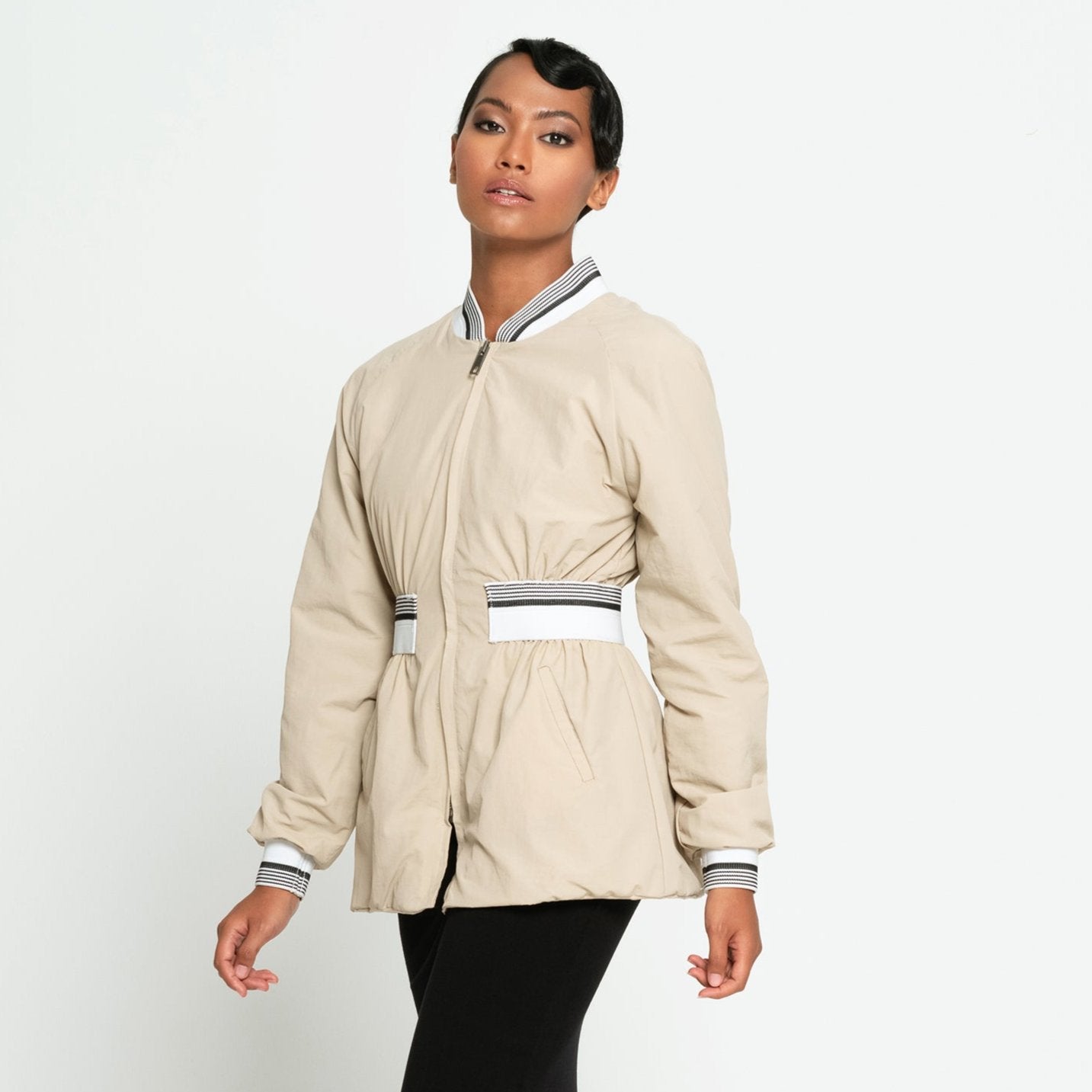 The 'Kamala' jacket features a feminine military-style bomber silhouette with a ribbed waist detail. Crafted from quick-dry, breathable recycled plastic fabric, it offers a liquid-repellent finish. Its slightly oversized cut effortlessly layers over lightweight sweaters and shirts, making it the perfect choice for daily wear or as a stylish travel companion for your next adventure.