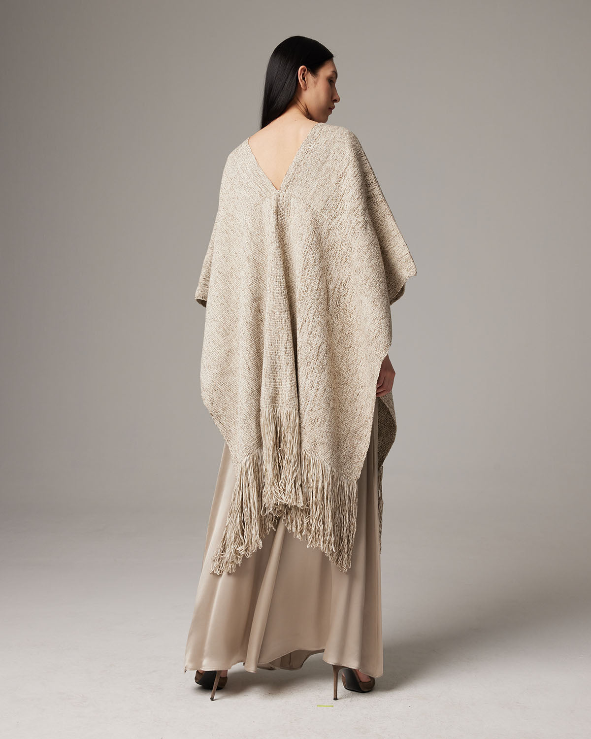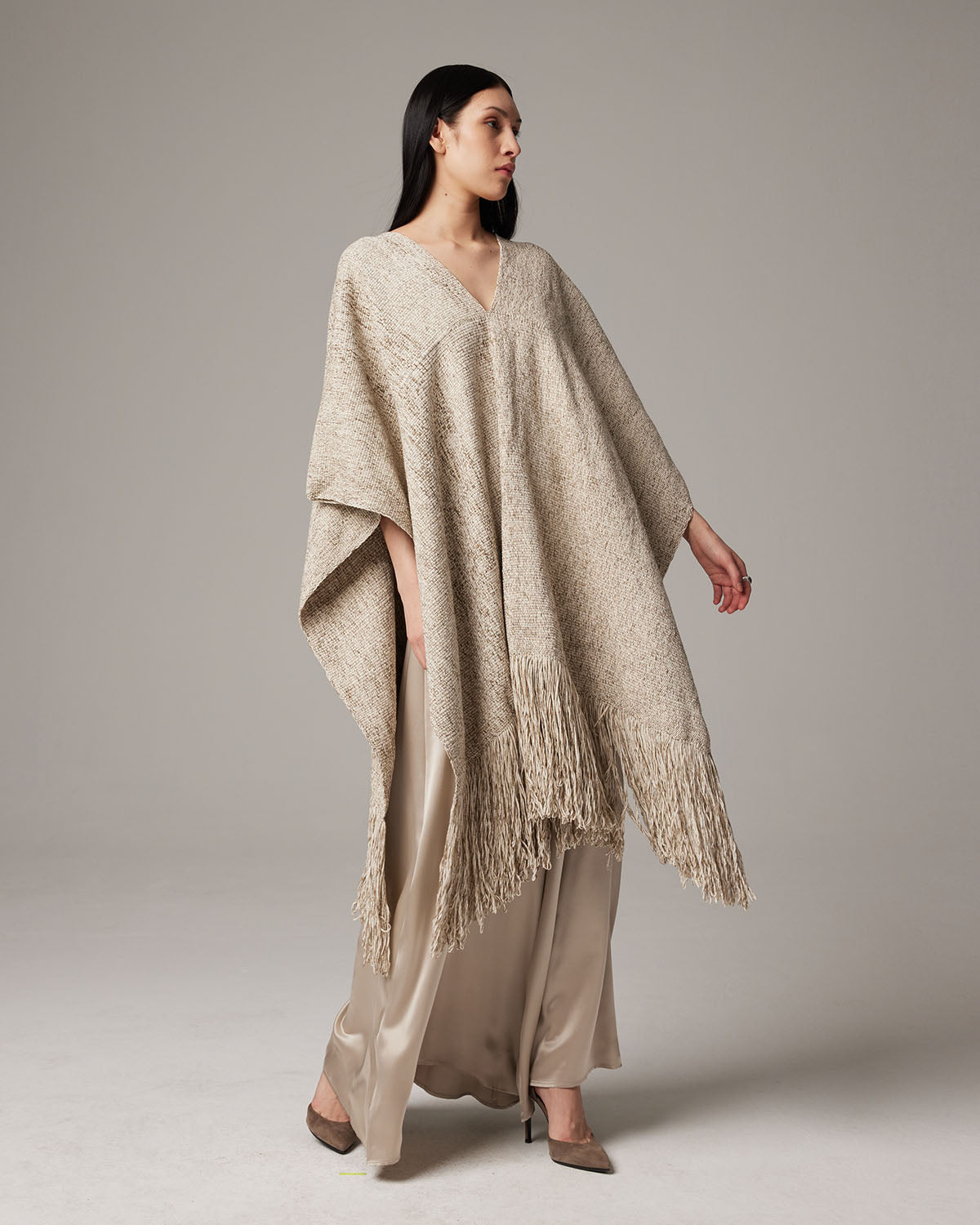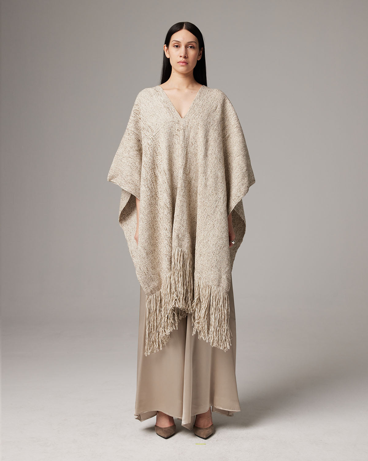 Luxurious, long, manta hand-loomed in decorated Italian yarn. A structured and dramatic layer.