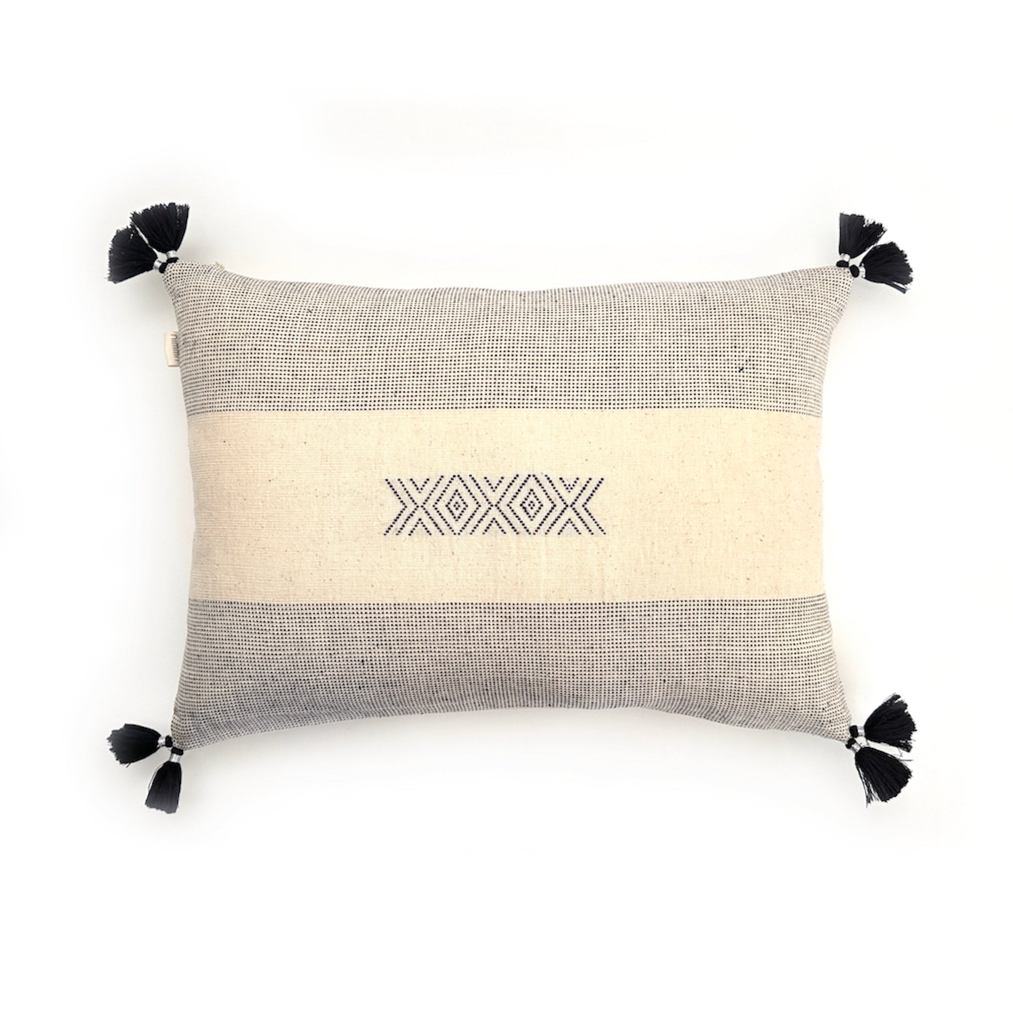 100% Organic Cotton handloom handwoven front with plain back pillow cover with bottom invisible zipper and tassels at four corners.