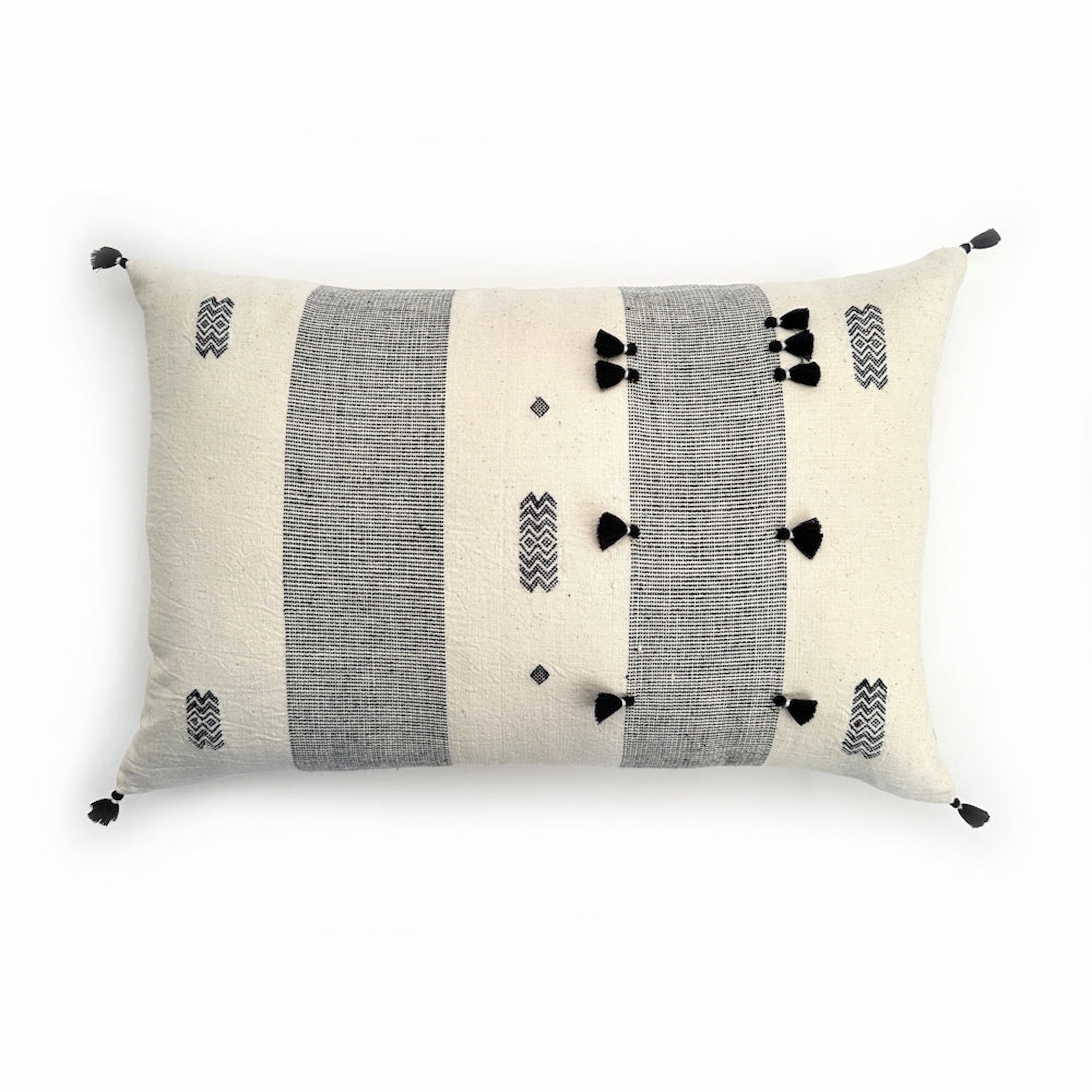 100% Organic Cotton handloom handwoven front with plain back pillow cover with bottom invisible zipper and tassels at four corners.