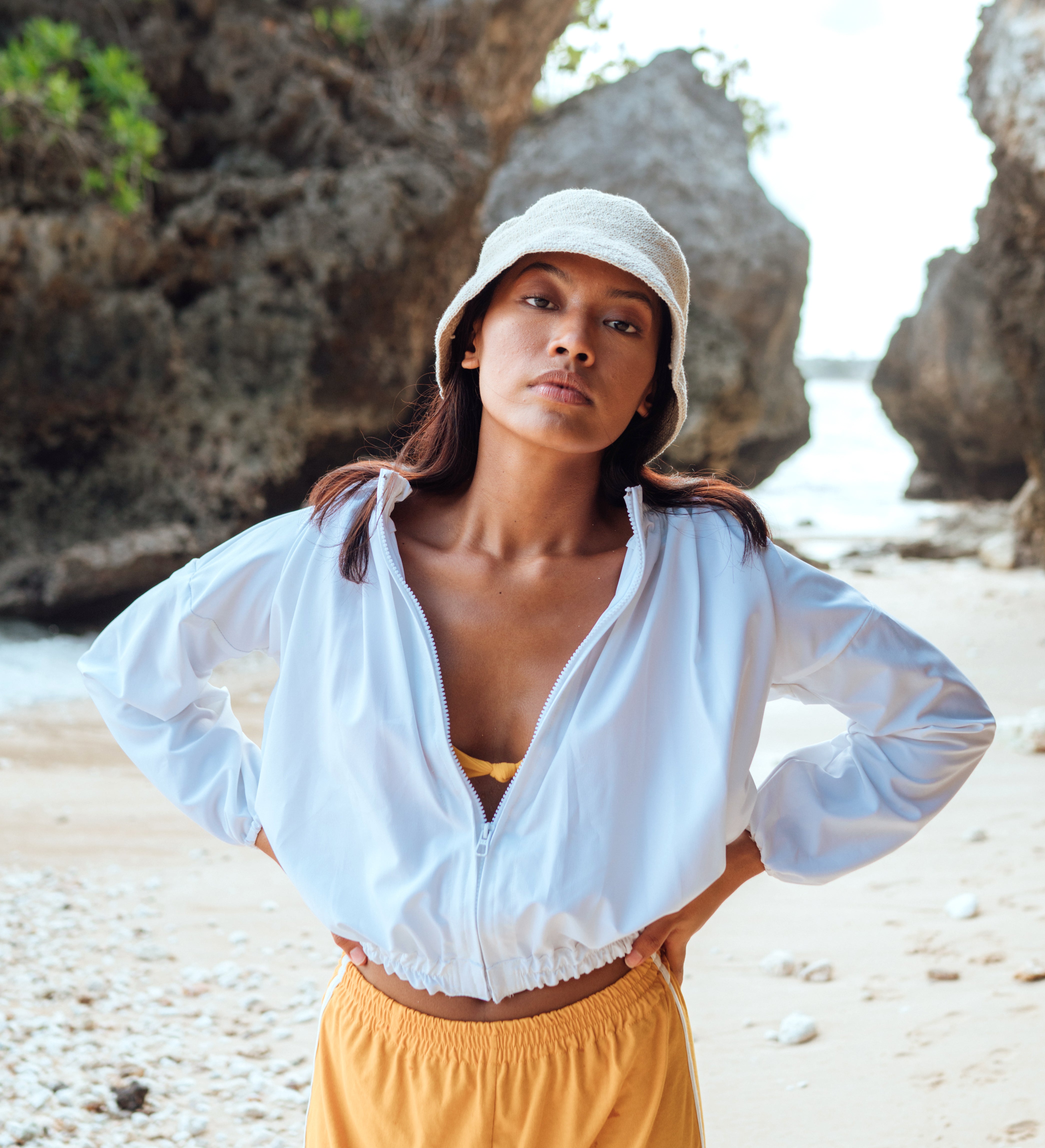 Light and breathable liquid-repellent jacket made of REPREVE's recycled plastic bottles fabric. This amazing fabric is so soft and airy you won’t believe it actually repels fluid and has UV50+ protection as well, to keep you comfortable in any weather. Easily channel from work to beach and evening events with its bold & stylish design which fits for every occasion. Our NORMA BEE jacket features chic puffy sleeves for the perfect “barely-there” feels and provides extra comfort for the skin.