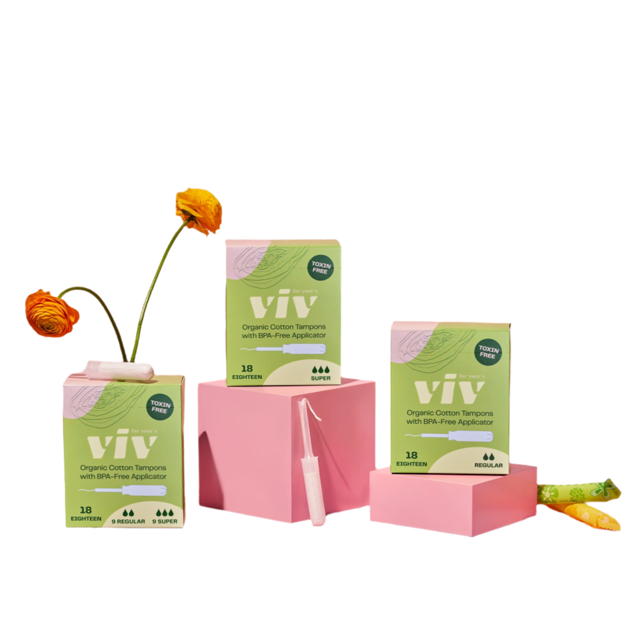 Viv tampons are completely toxin-free, made of 100% organic cotton with an ultra smooth BPA-free applicator. Viv tampons cut out the harmful chemicals and uncomfortable plastic, giving you a safe, healthy, & earth-friendly period.
