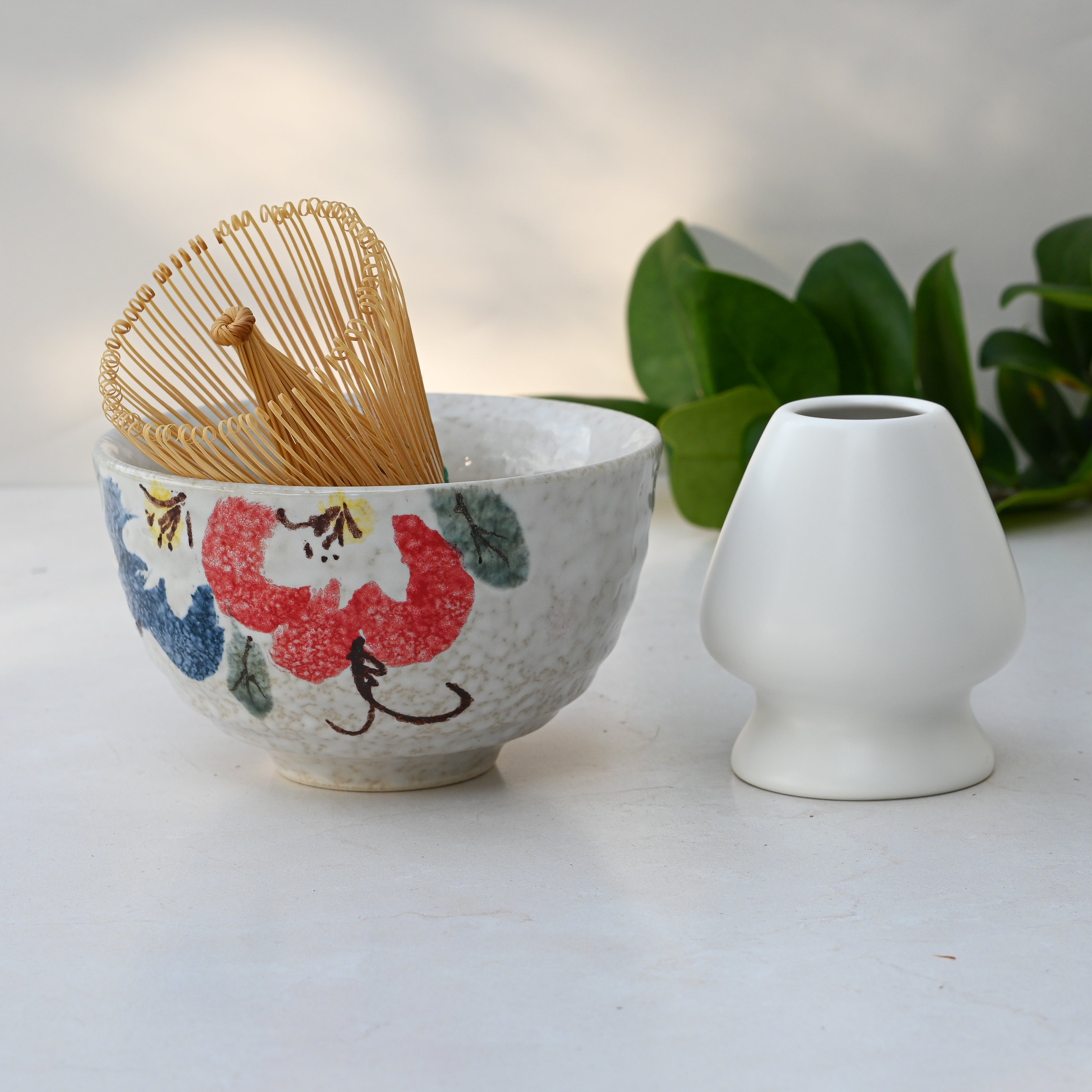 Beautifully glazed ceramic matcha bowl for moments of calm, this red and blue floral design brings a charming touch to your tea ritual. The textured, off-white glaze gives it a rustic charming character, while the floral motif in vibrant red and blue, accented with delicate yellow and brown, adds warmth and depth. Thoughtfully designed for aesthetics and convenience, this bowl is a perfect companion for your matcha preparation.