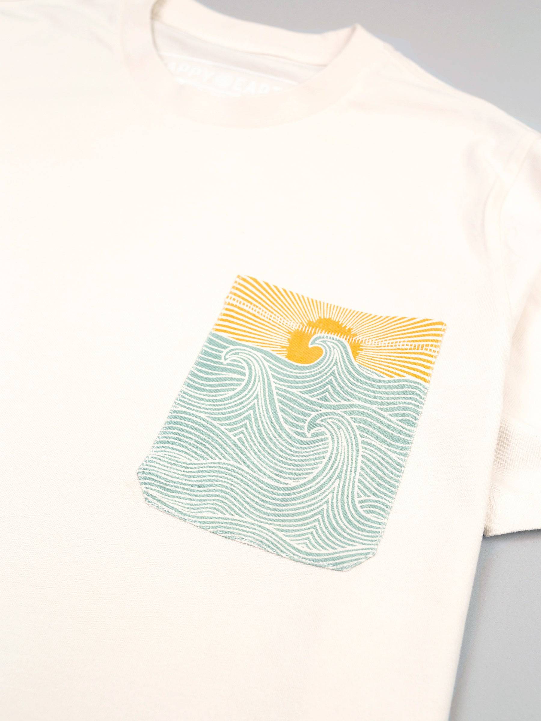 The sun sets on cresting waves; a picture of serenity on the pocket of this oat-colored tee.