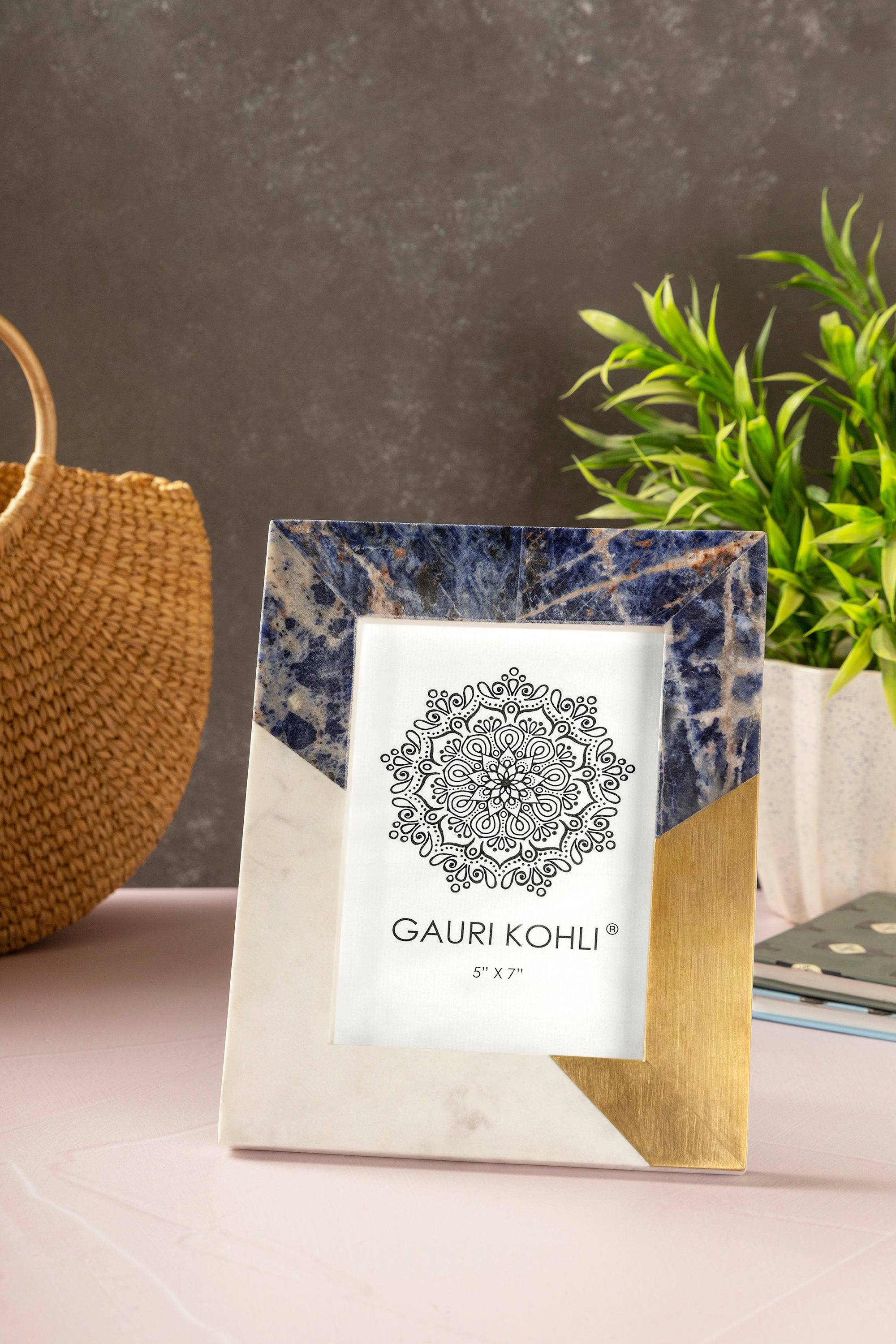 GAURI KOHLI marble and blue lapis picture frame is handcrafted by skilled artisans from Rajasthan, India. This semi-precious stone photo frame is the perfect way to frame and display those cherished memories.