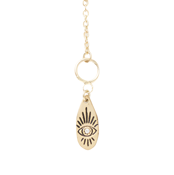 This handcrafted gold finish on brass necklace, comes tastefully packaged on a card, features and evil eye carved on the pendant and is inlaid with a 1.5mm cubic zirconia. It can be worn at two different lengths, or with the charm to the back.