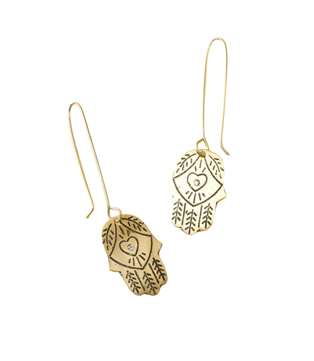 The Ruchi Collection features new age motifs in dainty gold or silver tone on brass settings with a delicate cubic zirconia accent. The Ruchi Hamsa Gold Dangling Earrings are intricately etched with ferns and a radiating heart with a tiny cubic zirconia studded in the center of the heart. The hamsa is an age old amulet known as a symbol of protection across many cultures. A symbol that is timeless yet on trend these Hamsa hand earrings would make a great gift for teens, students and women across generations.
