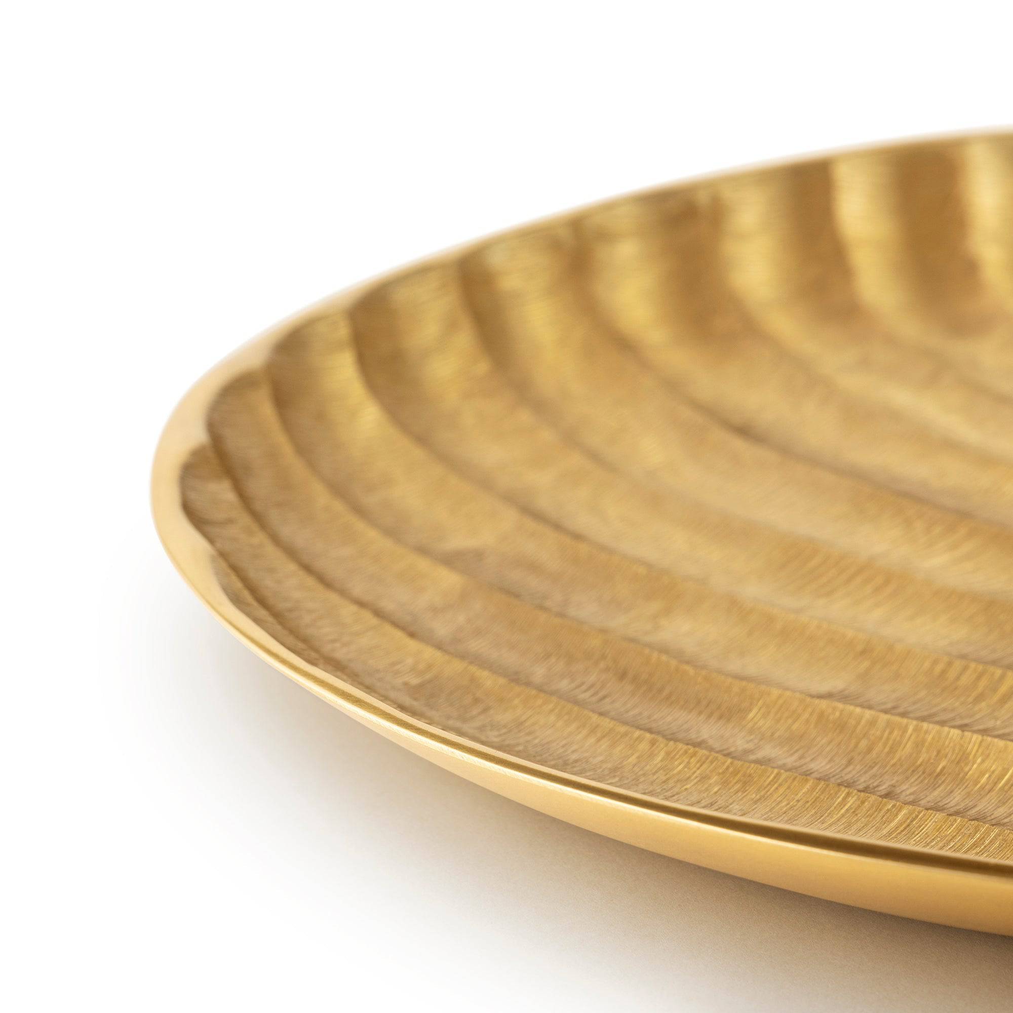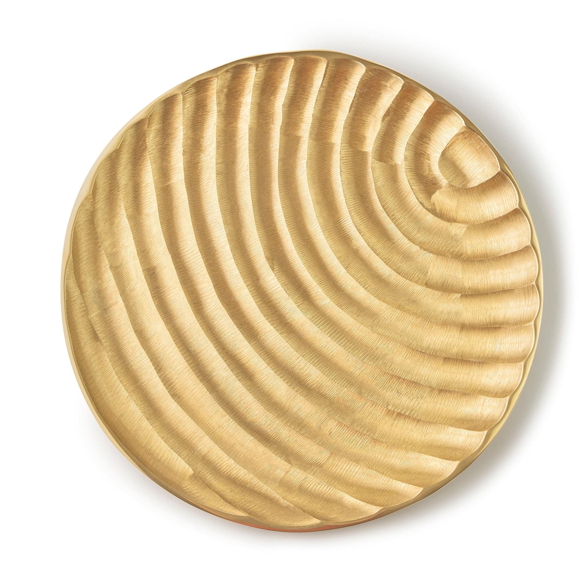 With its round shape and deep ridges, this large size decorative tray is an alluring home décor accent, artfully crafted by detailed artisans in India. Crafted in cast aluminum with a matt gold finish, this contemporary style tray features a subtle curved and etched design. Use as a stand-alone, or add a dried floral arrangement or your favorite decorative orbs to create a stunning accent for a credenza or bookcase in your home office, dining room, or living area.