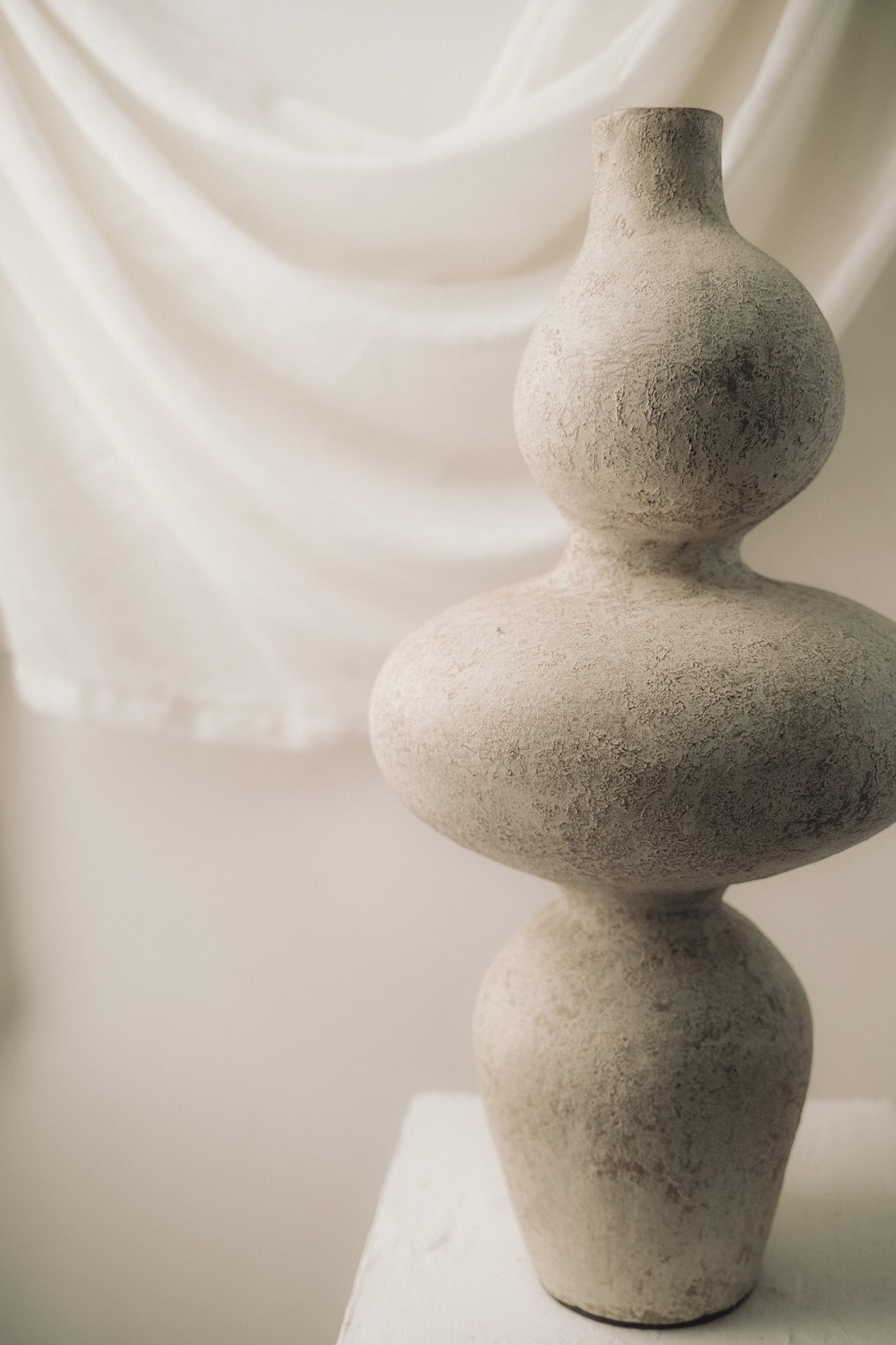 The Sewu vessel is a mesmerizing terracotta sculpture handmade by local Indonesian artisans. A more abstract take on sculptural shapes, this piece takes inspiration from the crown of the Sewu temple featuring curvaceous layers that taper along the middle and at the top. Its striking shape color and textured vintage finish adds to its unique features. Use it as an eye-catching decorative vase for florals or as a standalone decorative piece that adds vivid contrast to both traditional and contemporary spaces.