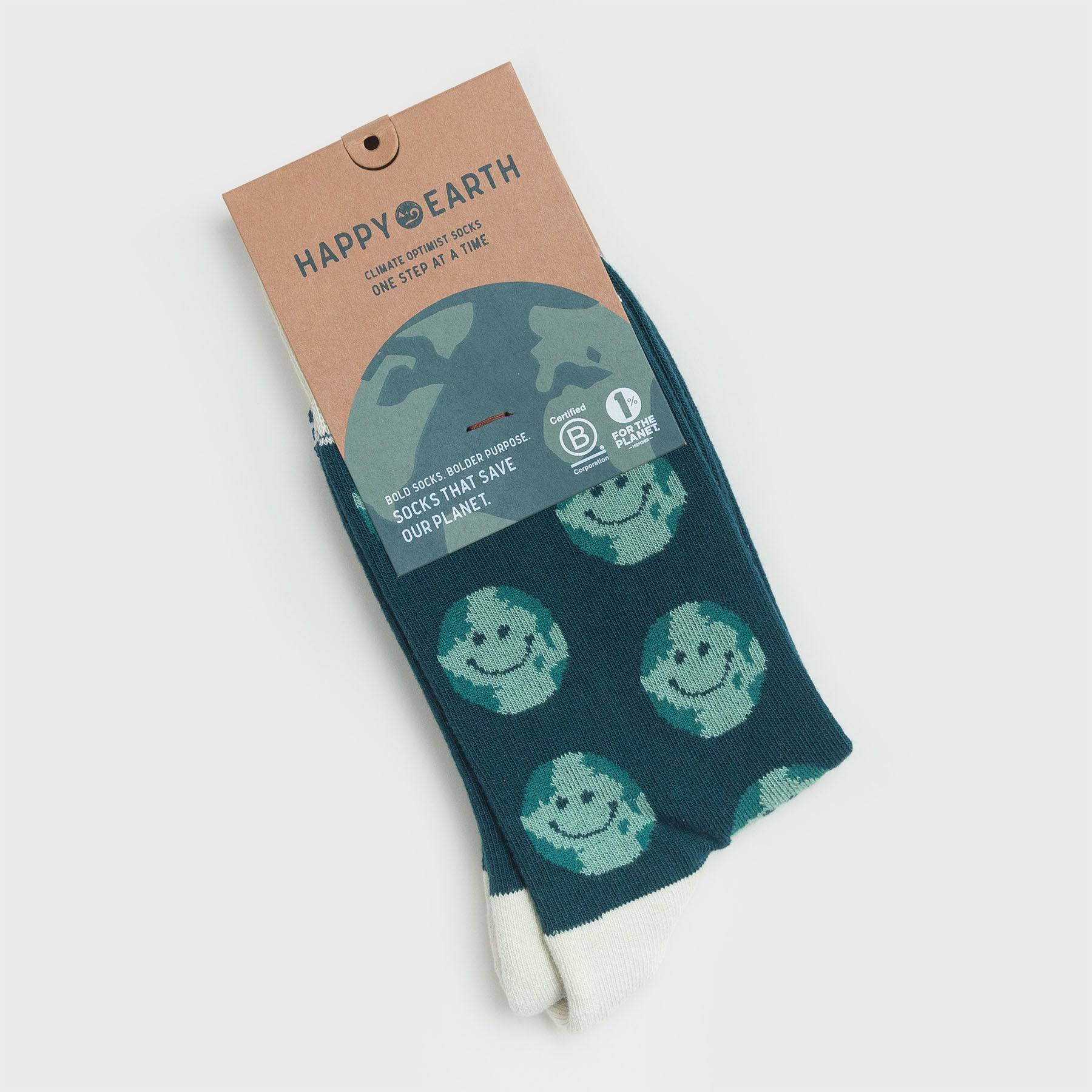 Happy feet and happy planet - comfy, eco-conscious socks for the one who's always looking on the bright side! Teal body with white toe and heel, decorated with smiling planets.