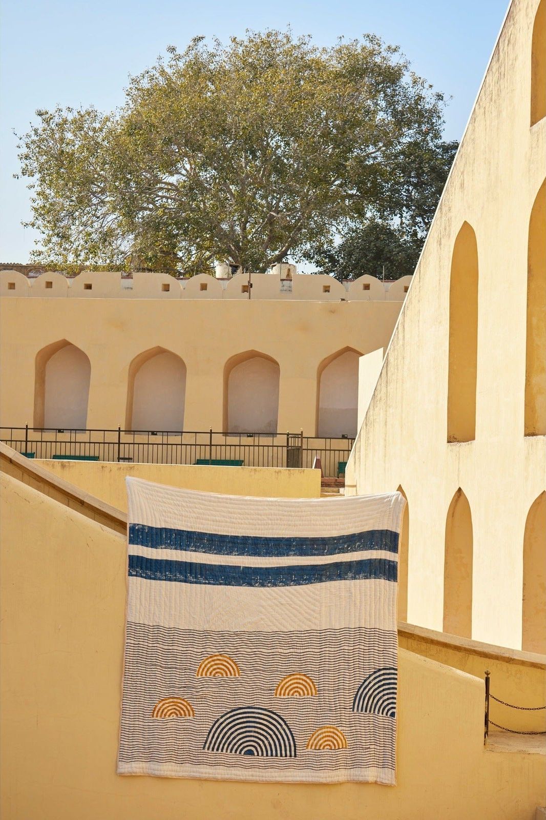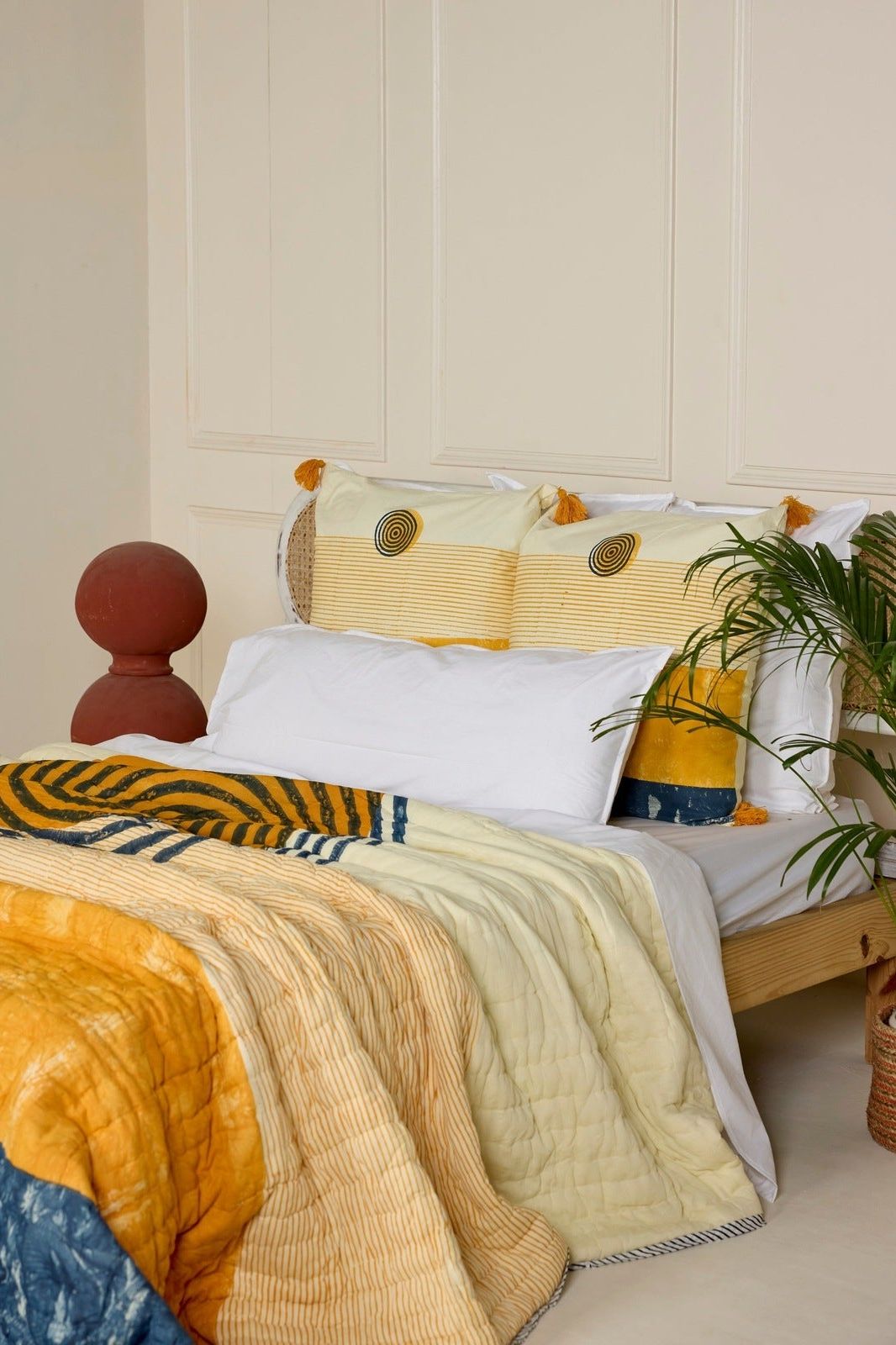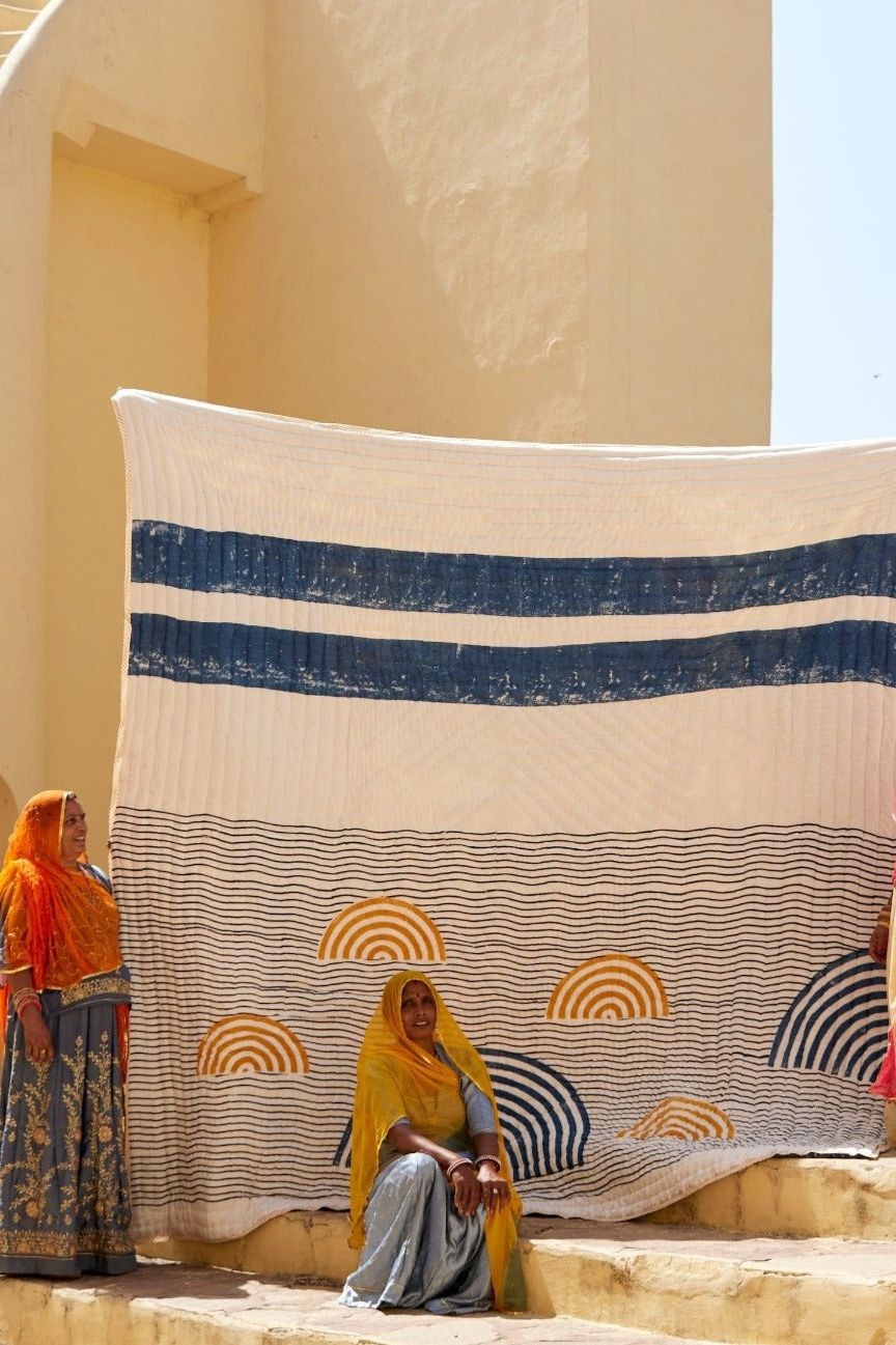 The design is hand-pressed onto each quilt using hand-carved wooden blocks dipped in dyes. The printed cotton shells are brought to the homes of quiltmakers, who stuff and stitch the quilts by hand, creating the final product.