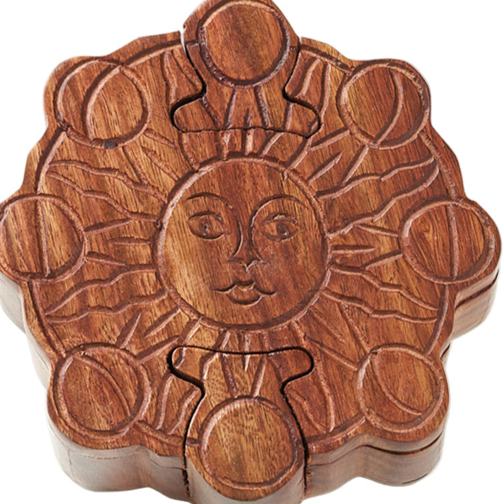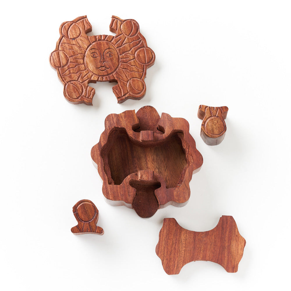 This unique puzzle box is handcrafted in North Central India. The hand carved lid design features an etched sun in the center and moon phases around the perimeter. Artisans use hand tools to skillfully carve blocks of sustainably harvested Indian rosewood into fine treasures. This puzzle box separates into five pieces with a secret storage space inside. The art of traditional Indian wood craft requires mastery, passed down thru generations, to create the intricate carvings and smooth, polished finish. Lovely celestial gift for yourself or someone special in your life.