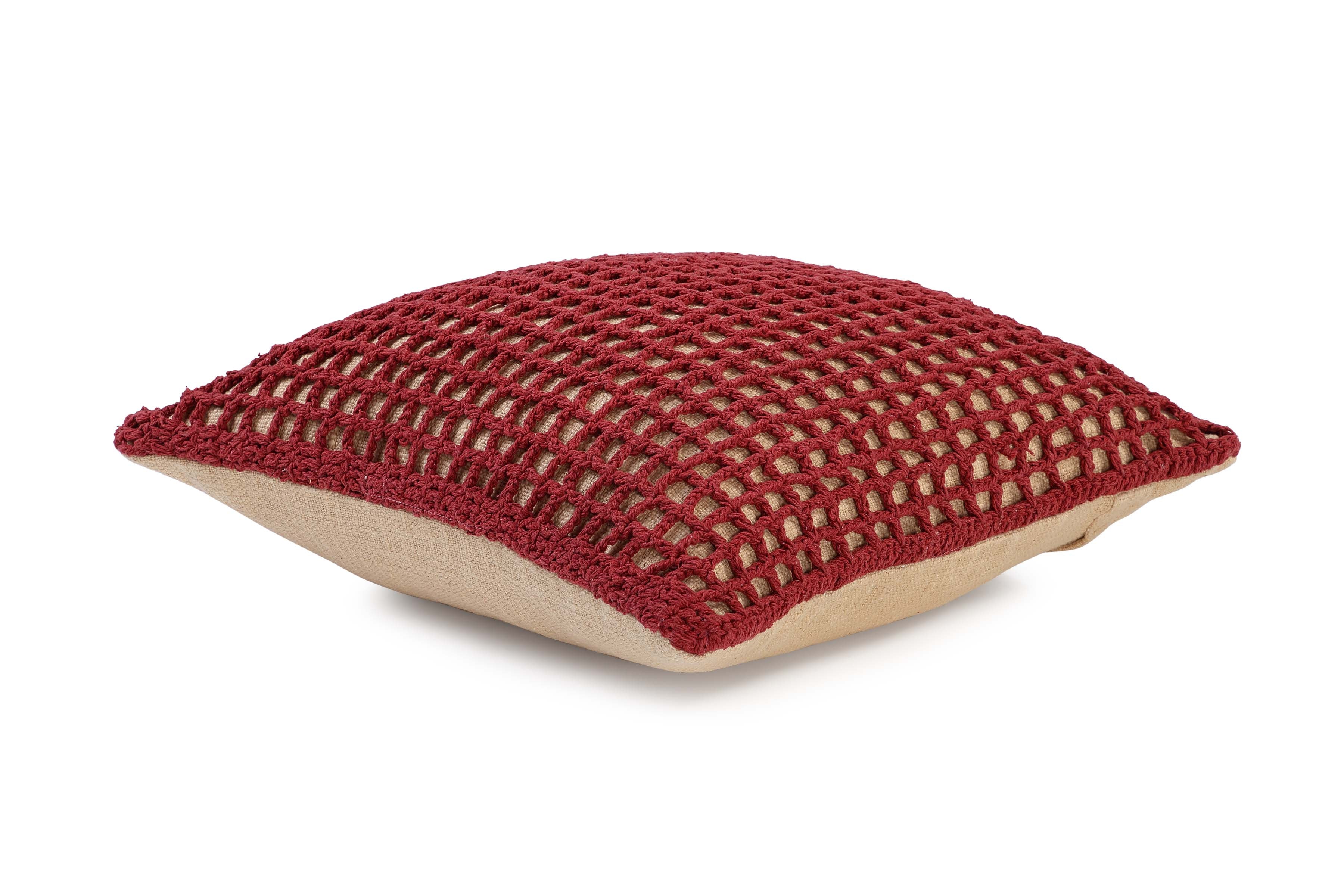 Tarika Net Crochet Accent Cushion's intricate net pattern showcases the skillful interplay of openwork and texture, creating a captivating visual effect. The rich wine-red color adds depth and sophistication to any space, making a bold statement.