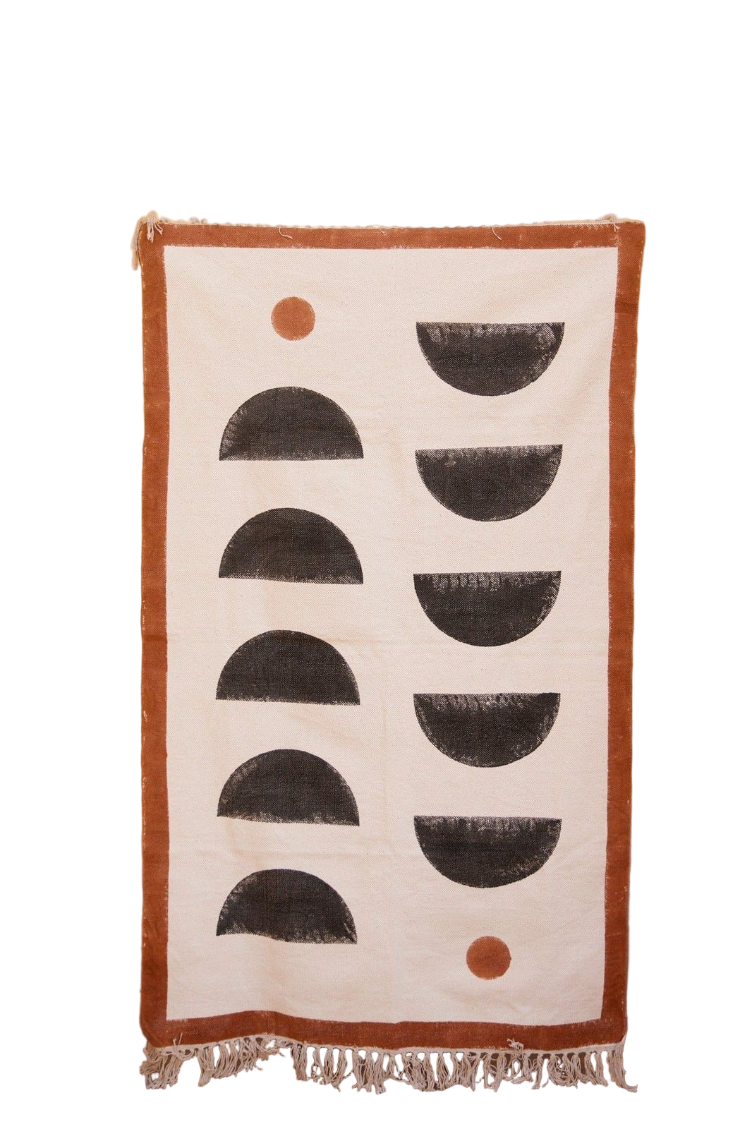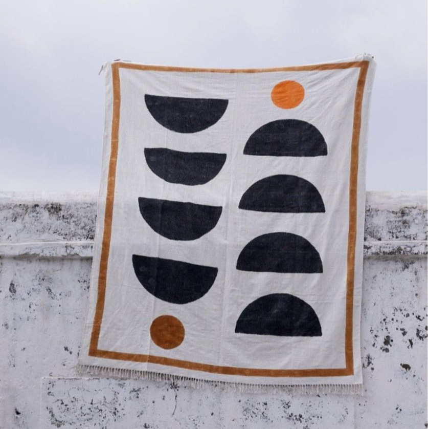 The design is hand-pressed onto each rug using hand-carved wooden blocks dipped in dyes. All rugs are made in small batches.