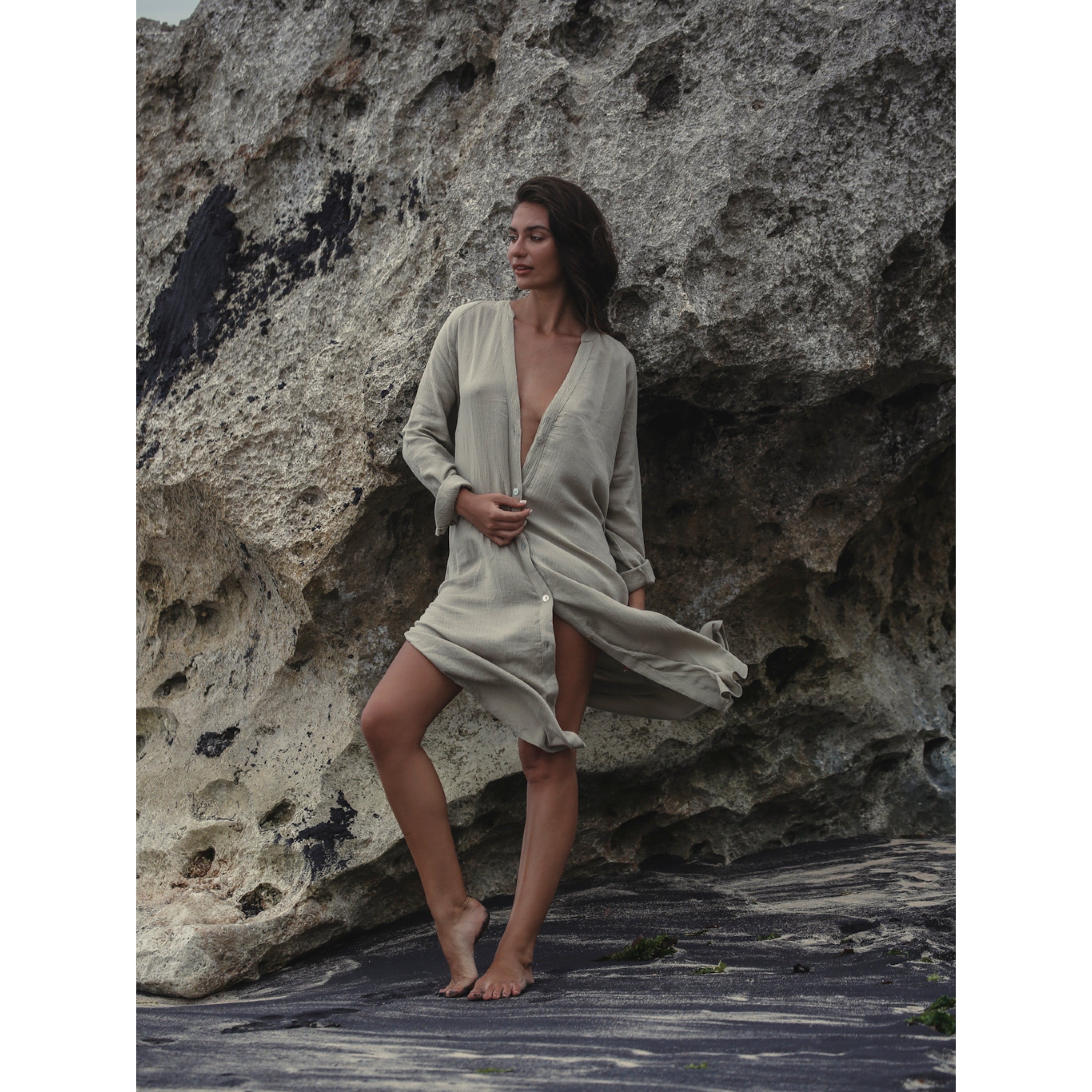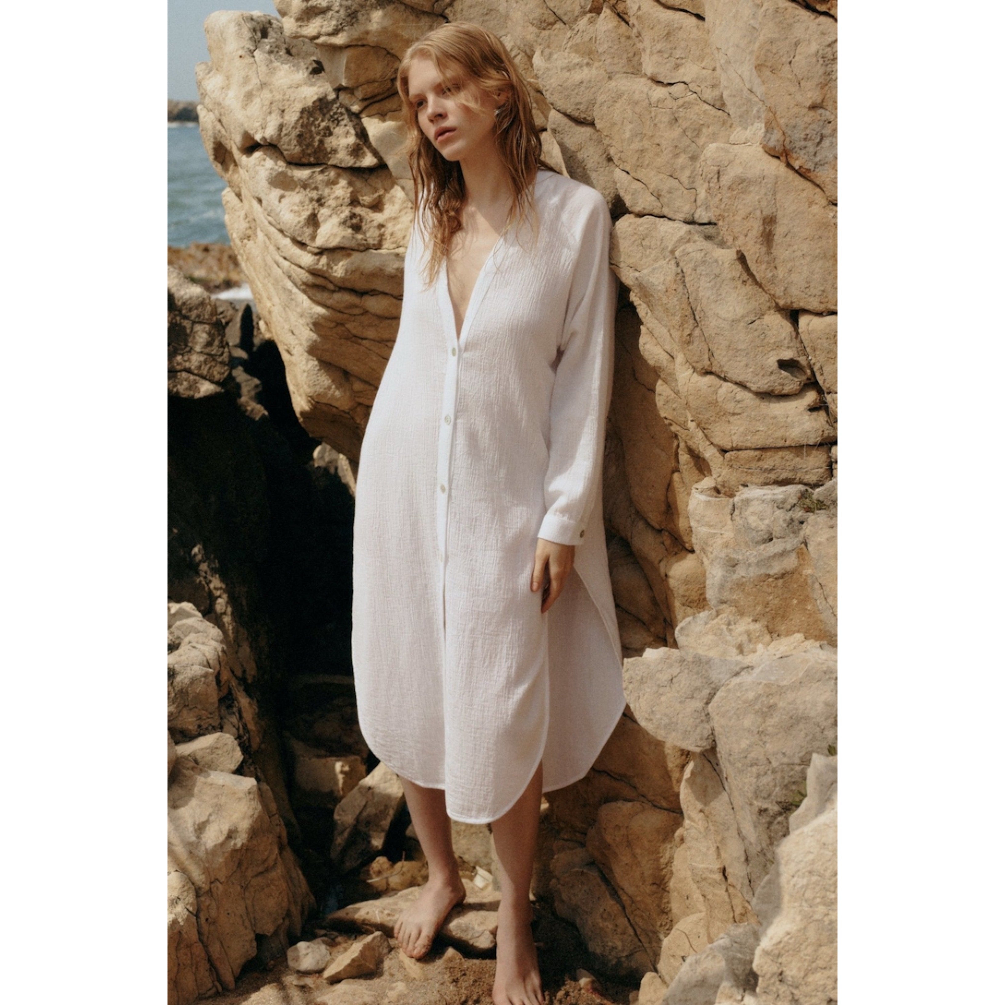 Designed as a trans‑seasonal statement piece, this shirt dress brings classic shirting to the coast with a relaxed silhouette and a soft billow through the sleeves. Crafted from semi‑sheer, lightweight cotton for an airy flow, the pearl shell button‑down front and soft collarless neckline elevate the look from beach cover up to evening wear with effortless ease.