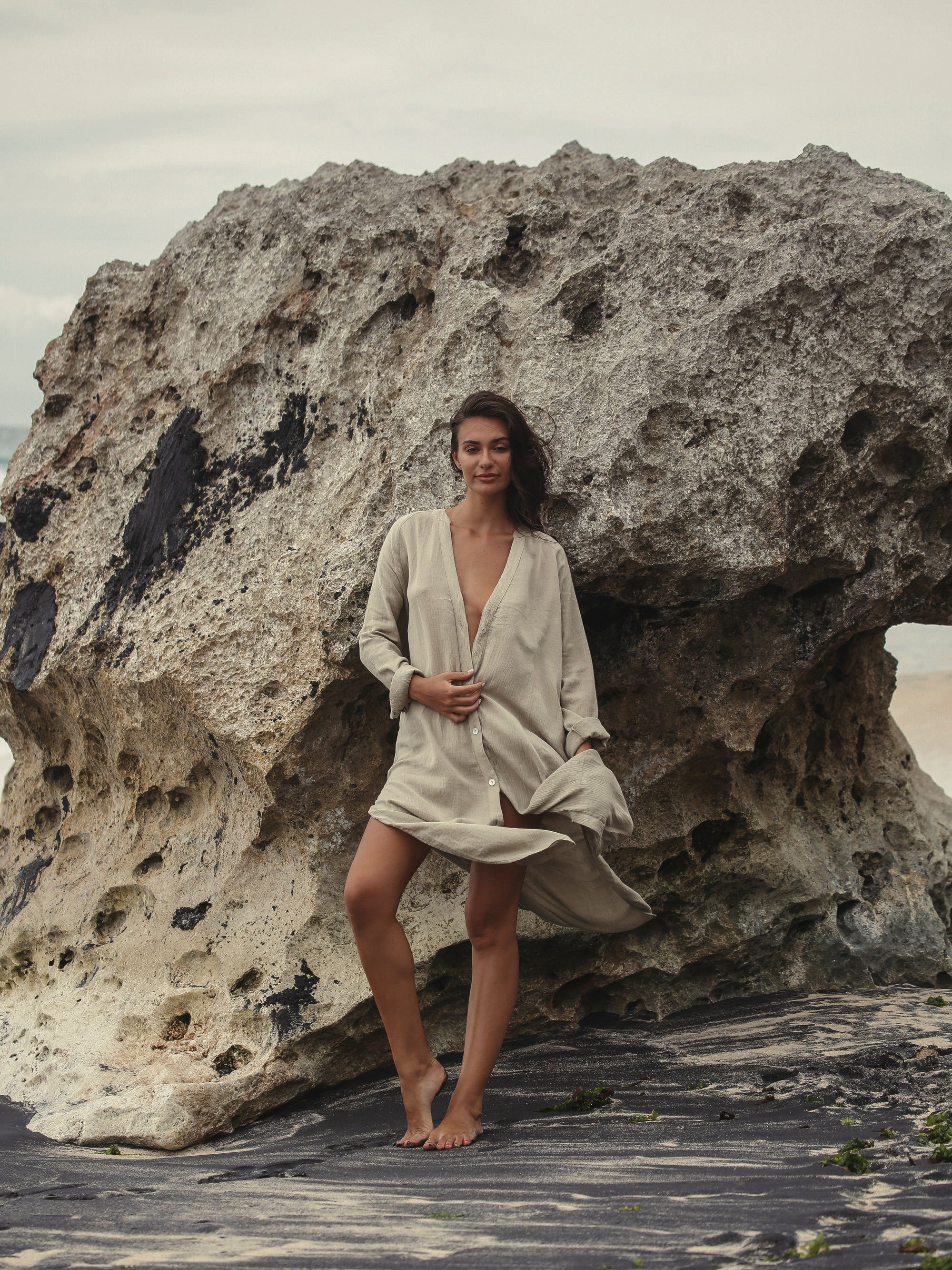 Wear it as a breezy beach cover up over a bralette, or cinch at the waist with a rope belt to style it as an elegant dress—finish with a chunky necklace for a polished, coastal look.