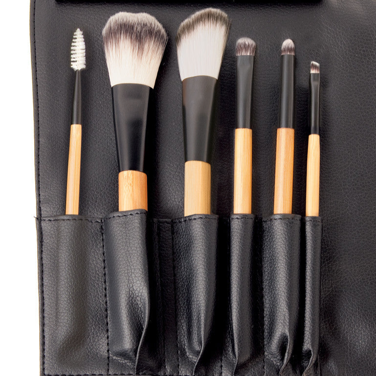 The six brush set includes the Blush Brush #2, Contour Brush #3, Medium Eye Shader Brush #7, Blending Brush #10, Small Angled Brush #13, Mascara/Brown Brush #16, unique brush pouch that rolls keeping your brushes safe and secure The material is synthetic and easy to clean with soap and water.