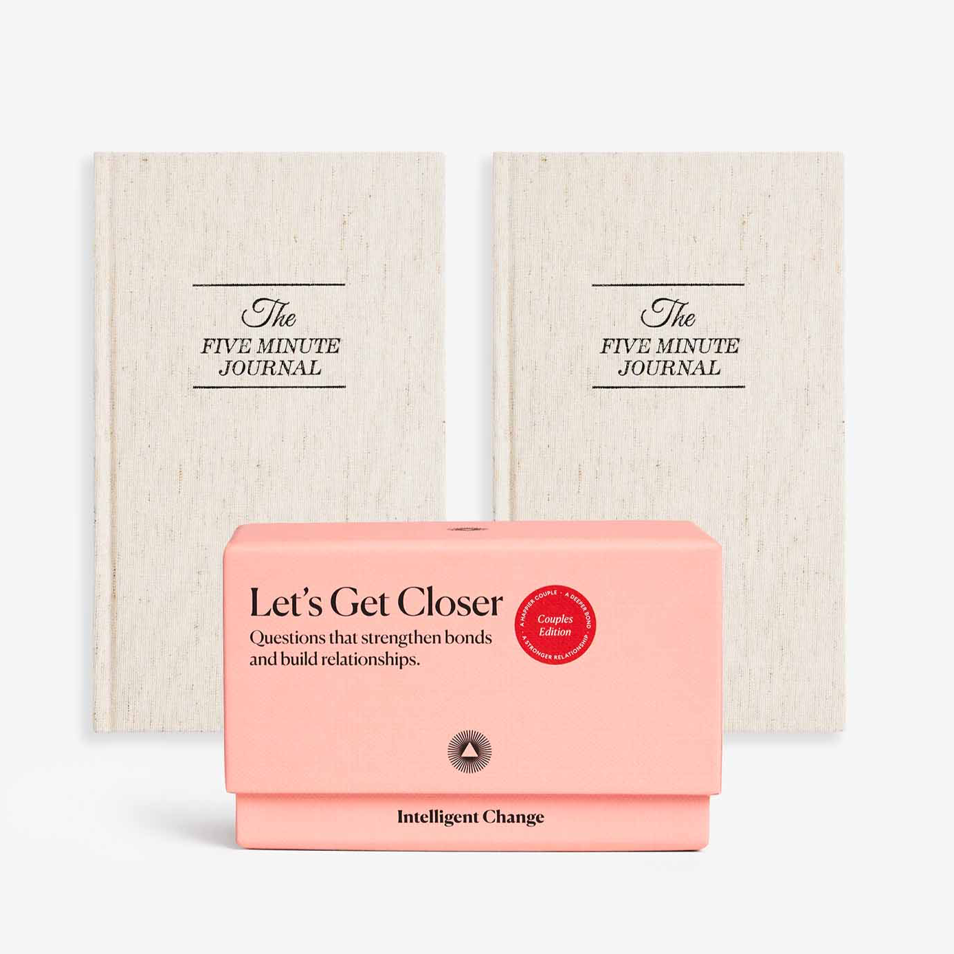 Build a gratitude ritual with your partner, spark meaningful conversations around love, and strengthen your bond with the Happy Couple Bundle, which includes two Five Minute Journals for you and your partner and the Get Closer Couples Edition game. Gain a more positive perspective on your life and relationships. Reflect on what truly matters to you as a couple. Define your love.