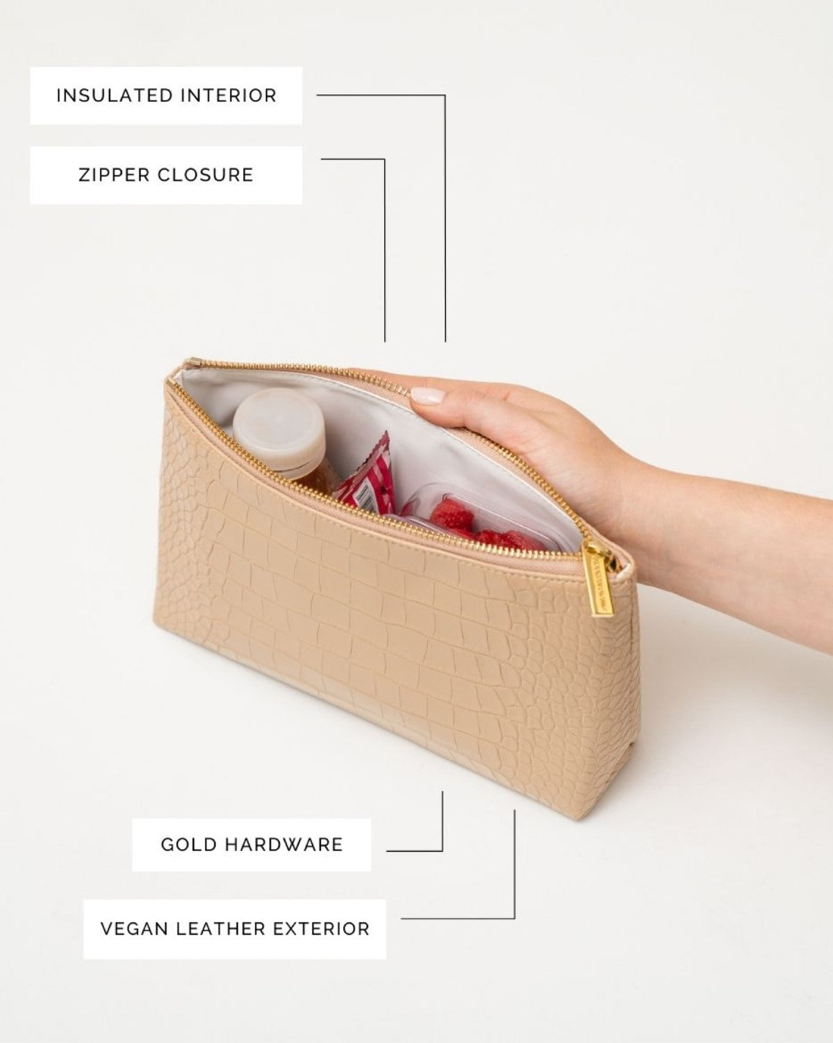 For more than just snacking - The insulated interior will keep your essentials cool + is easily wipeable (for those accidental spills). Throw it in your Tote, or carry it on its own - no one would ever know what was inside.