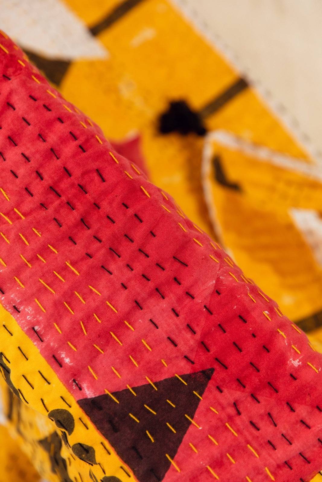 Each throw is handmade, requiring attention from 4 different types of artisans, including wood carvers, block printers, Kantha quiltmakers, and dye specialists.
