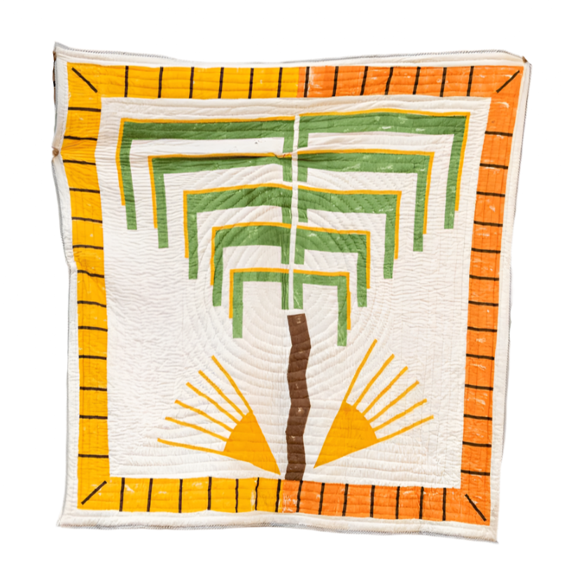 The design is hand-pressed onto each quilt using hand-carved wooden blocks dipped in dyes. The printed cotton shells are brought to the homes of quiltmakers, who stuff and stitch the quilts by hand, creating the final product.