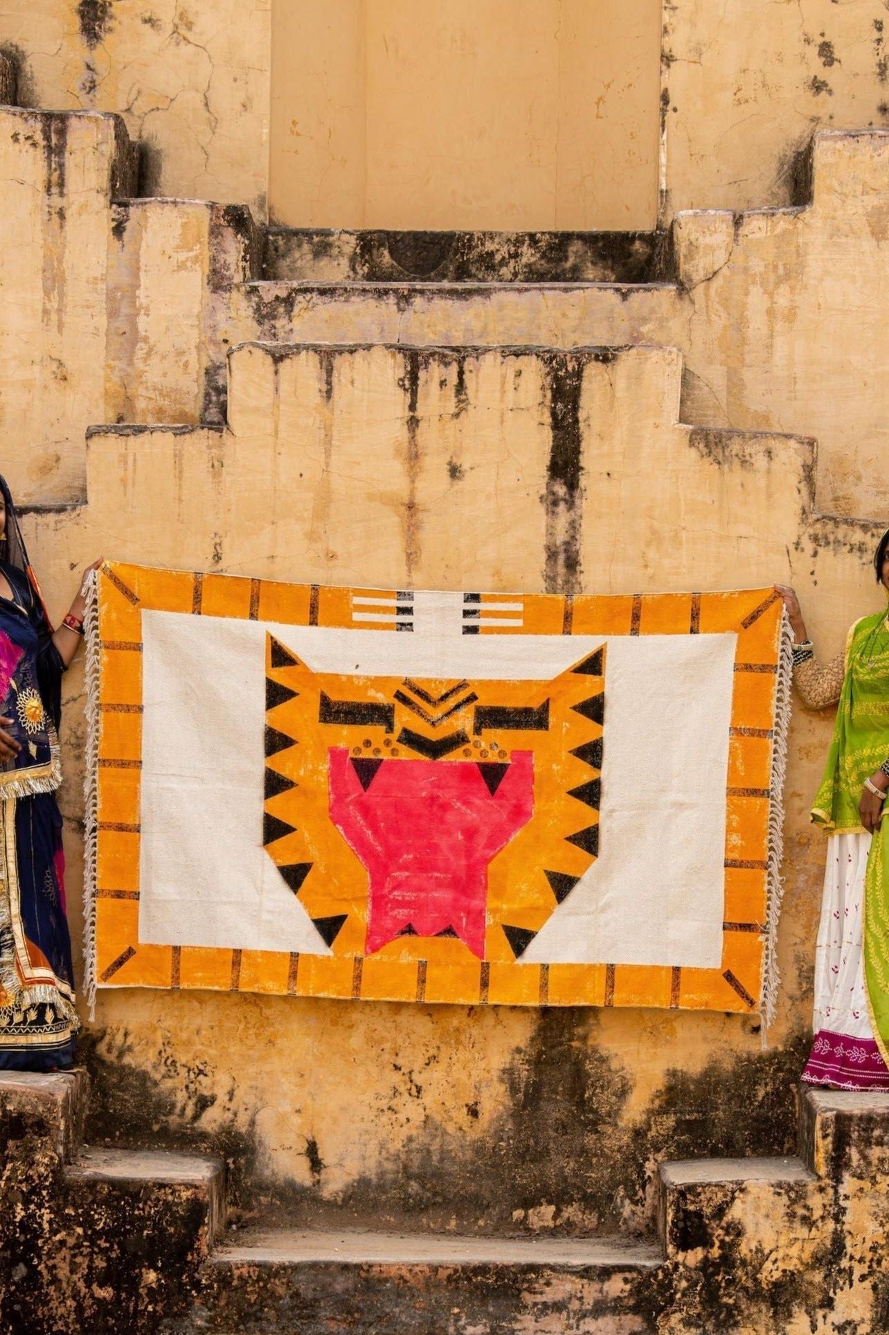 Each rug is handmade, requiring attention from 4 artisans, including wood carvers, block printers, weavers, and dye specialists.
