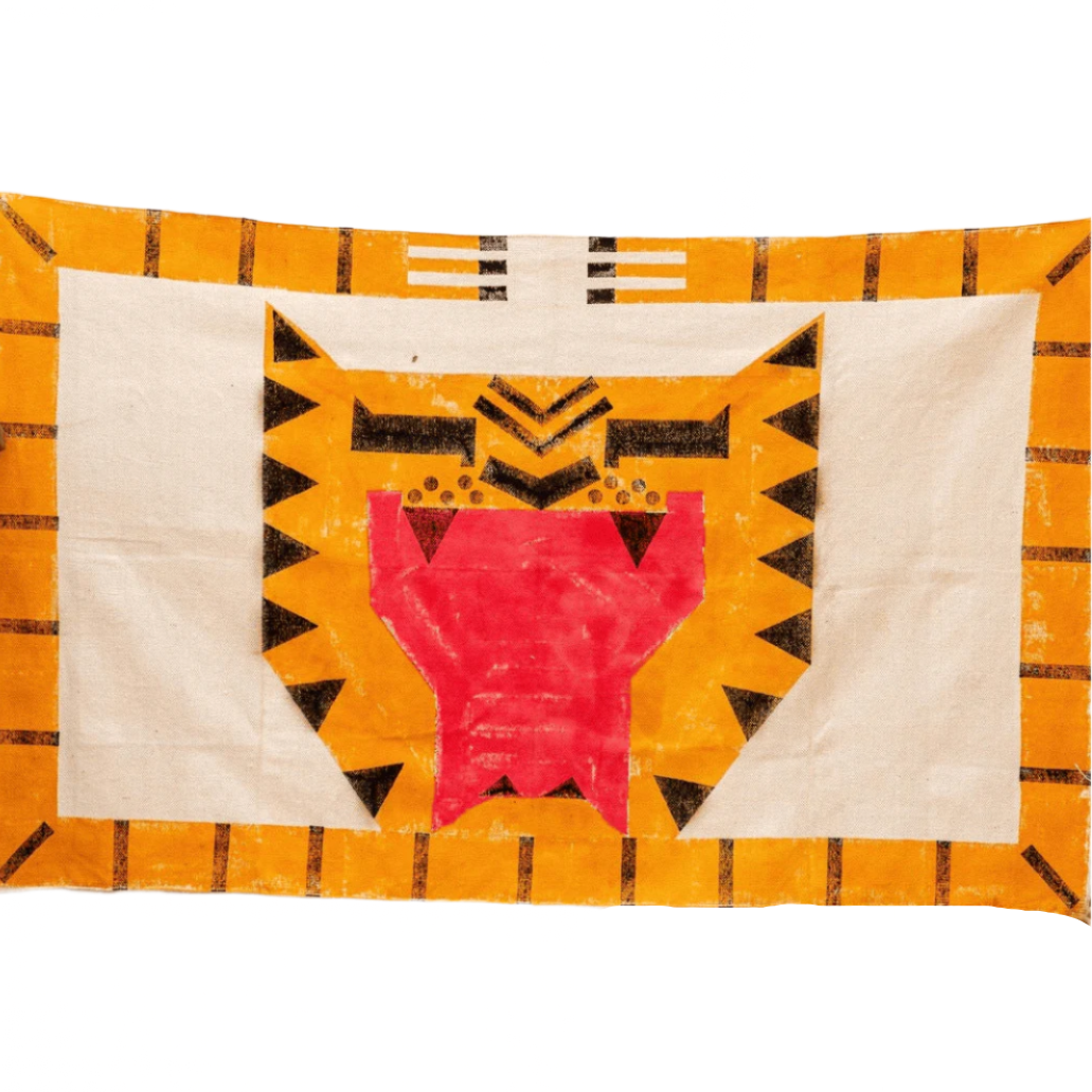The design is hand-pressed onto each rug using hand-carved wooden blocks dipped in dyes. All rugs are made in small batches.