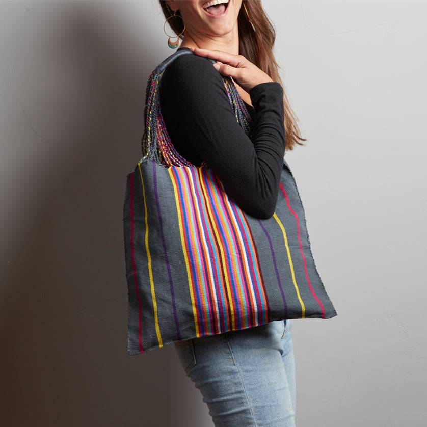 Perfect for the farmer's market, a day at the pool or beach, or as an everyday purse! Each Chiapas bag has vibrant stripes of color which carry on to the straps which are then intertwined with the base color of the bag. The tops of the straps are double wrapped to provide strength and comfort for your shoulder or your hands. These versatile totes are handwoven by artisans in Chiapas, Mexico, on a backstrap loom.