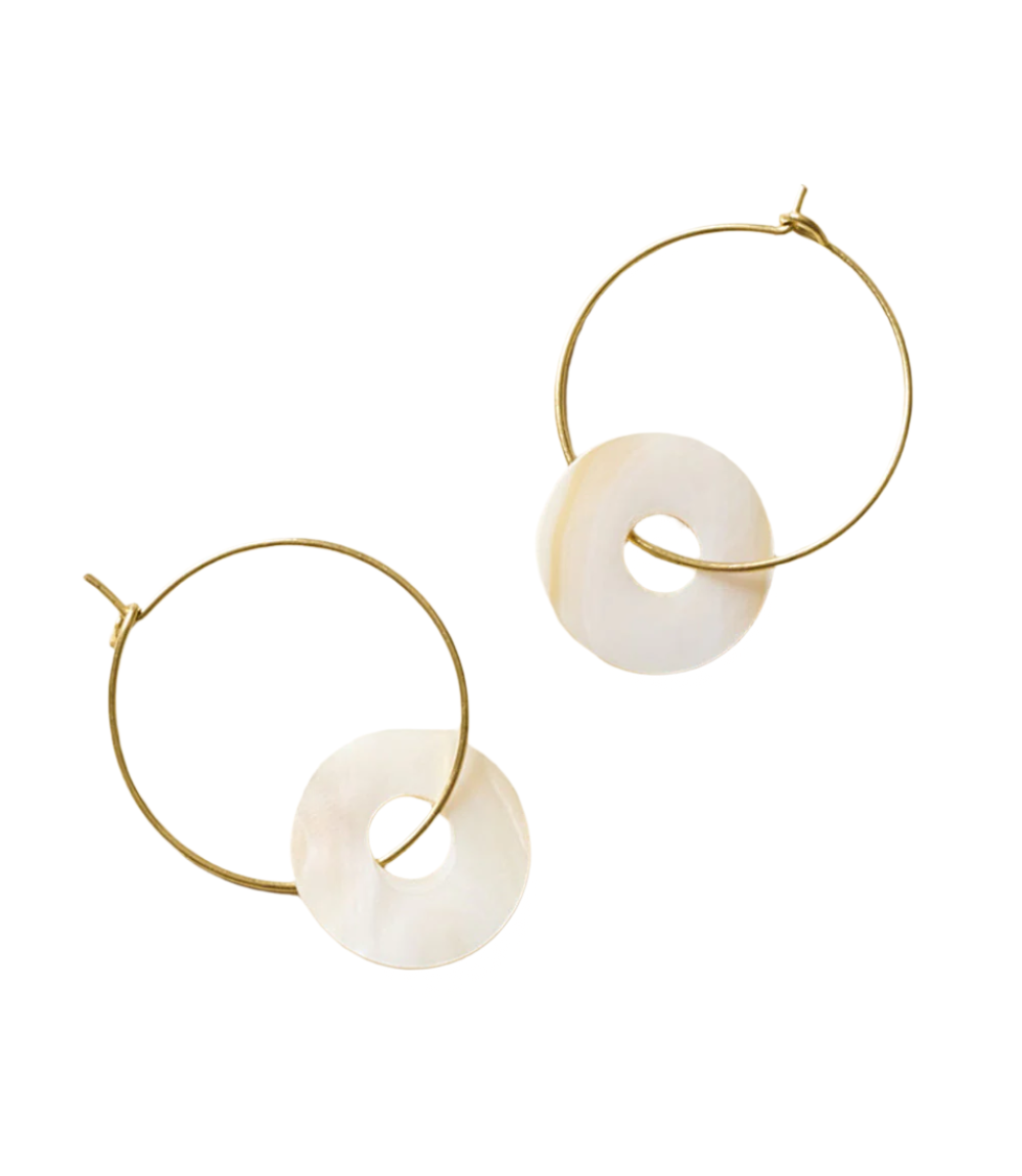 Our handcrafted Varidi earrings are a simple treasure of the water, featuring alluring mother of pearl disc charms in a refined, lightweight, gold finish hoop setting. These fair trade earrings are handcrafted by master artisans in Old Delhi. Artisans use traditional jewelry making techniques and tools to carve the delicate discs of ethically sourced shell. The result is an airy, minimalistic design with a polished finish for everyday wear. These versatile, dainty hoop earrings with charms will transition flawlessly from day to night, completing a casual chic, t-shirt and jeans combo, elevating a little black dress, or serving as the final touch for formal wear.